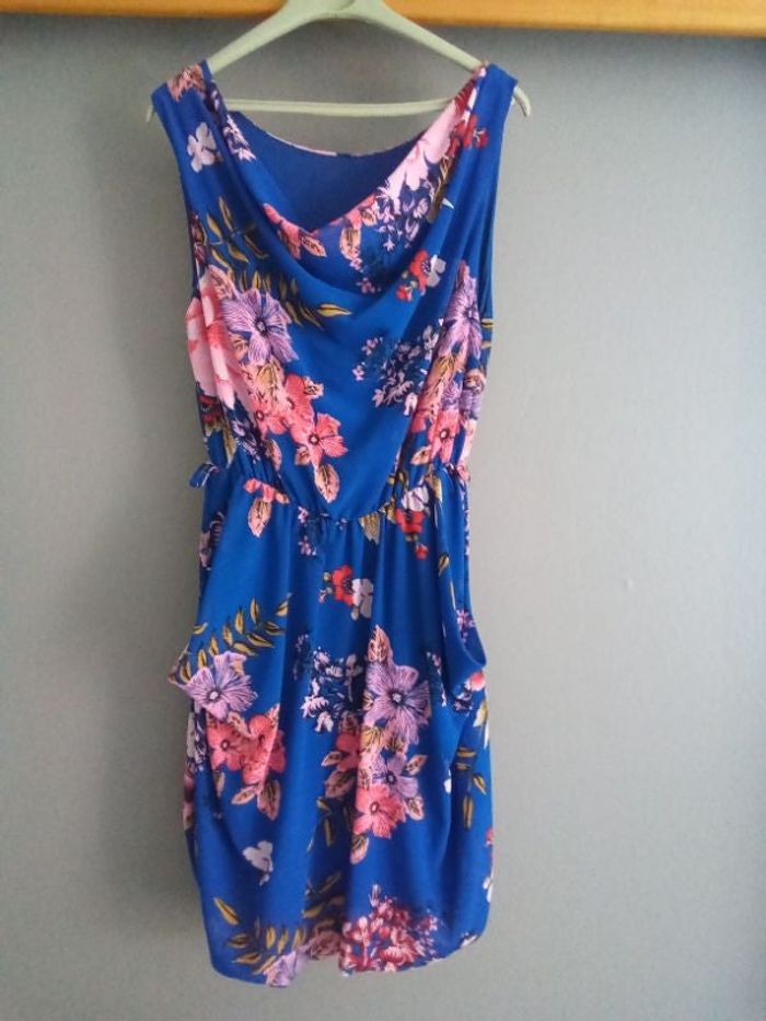 Petite robe ou tunique bleue motifs fleurs avec petites poches latérales. Longueur 85 cm et passants pour ceinture. Pratiquement neuve.