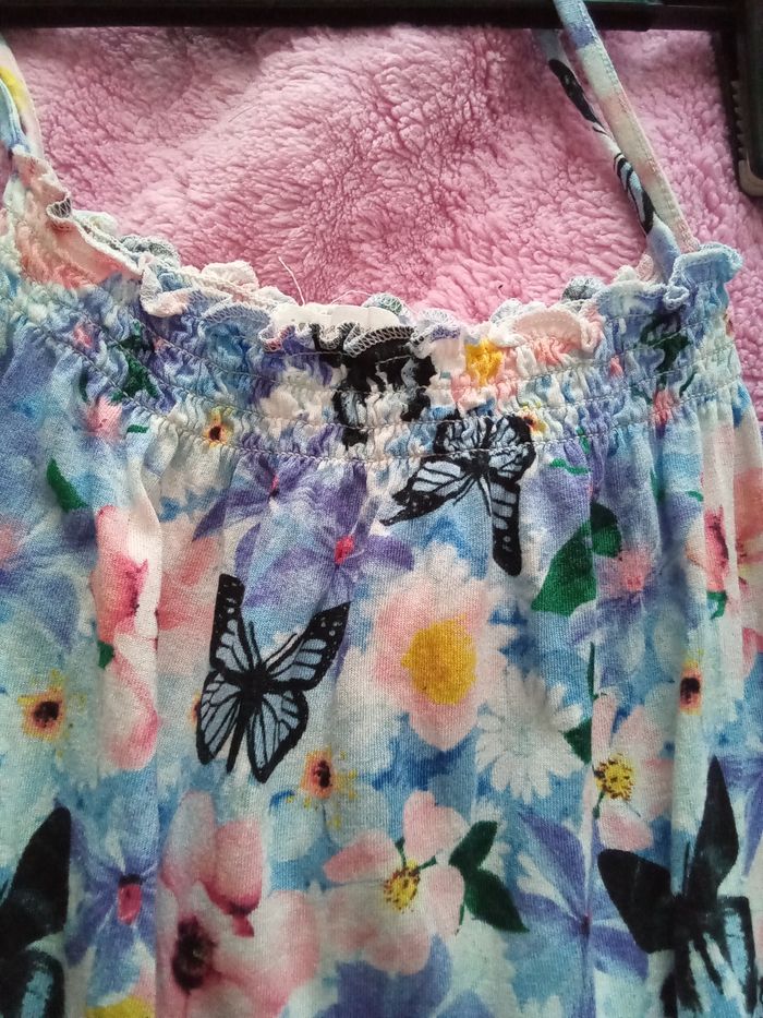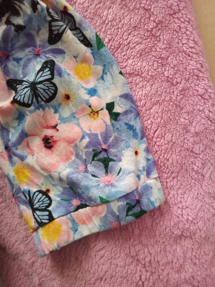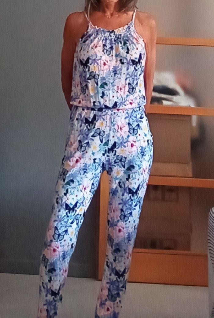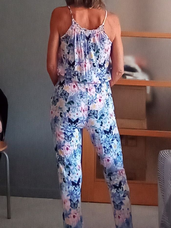 Combinaison fleurie avec smock en haut, élastique à la taille et en bas des jambes, poches latérales. Portée deux fois.