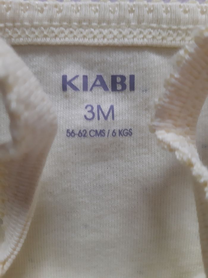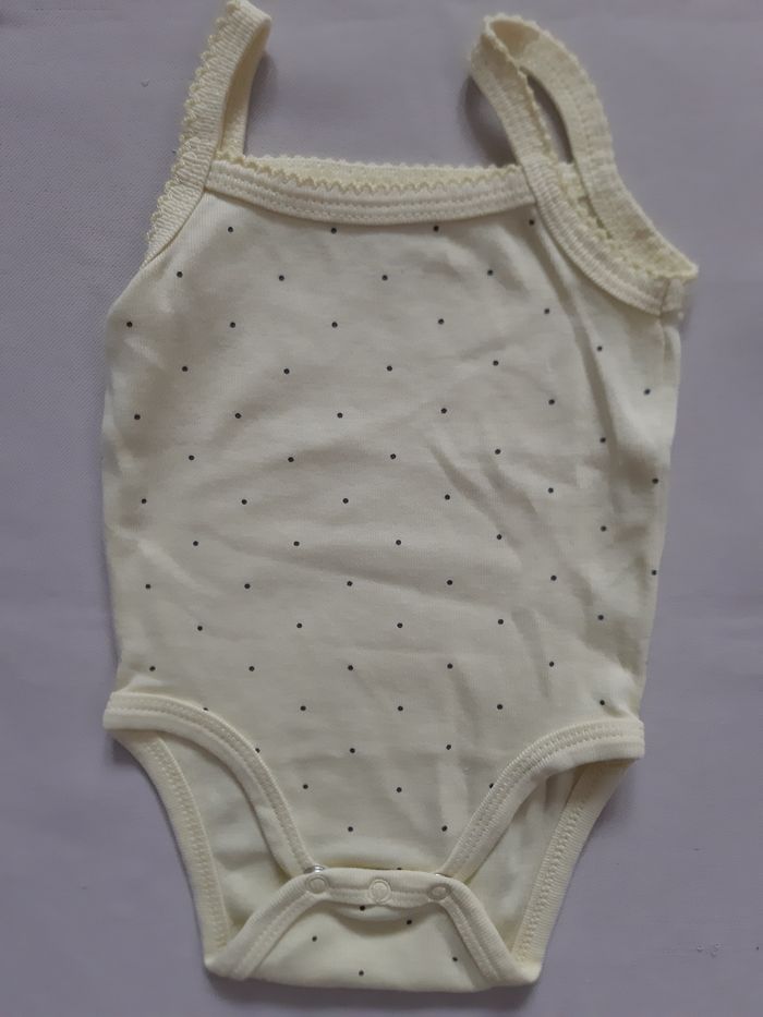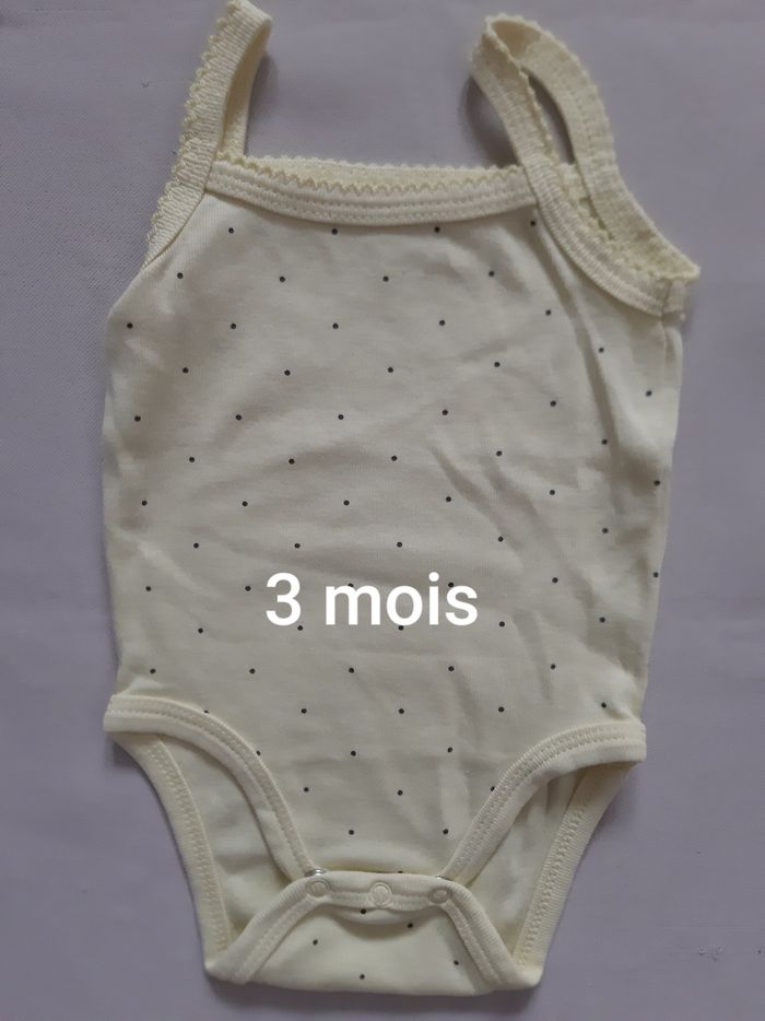 body à bretelles, de la marque Kiabi, en taille 3 mois jaune à pois noirs fermeture par boutons pressions à l'entrejambe En très bon état.