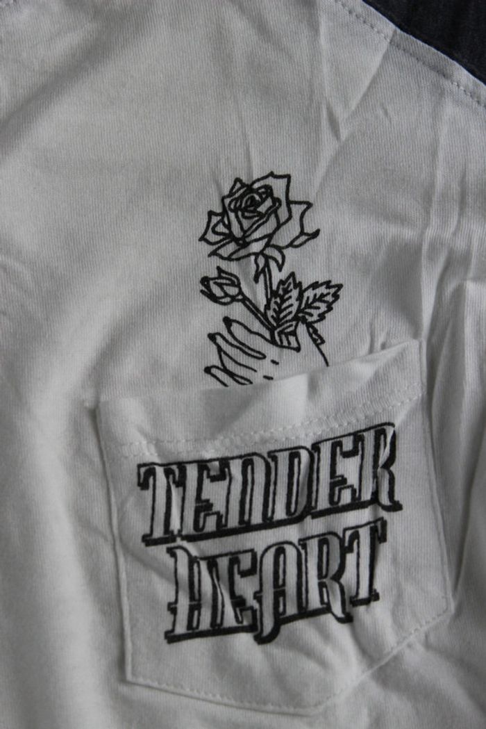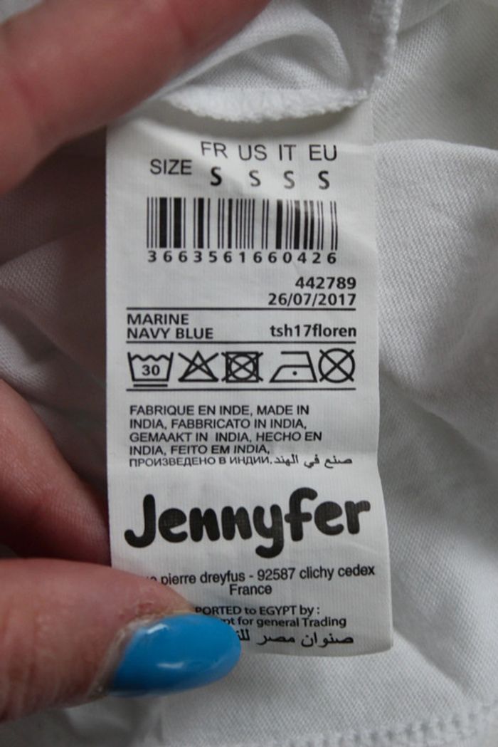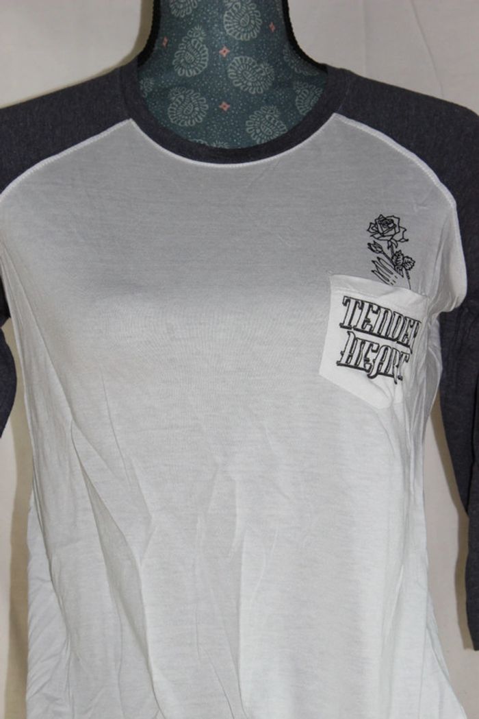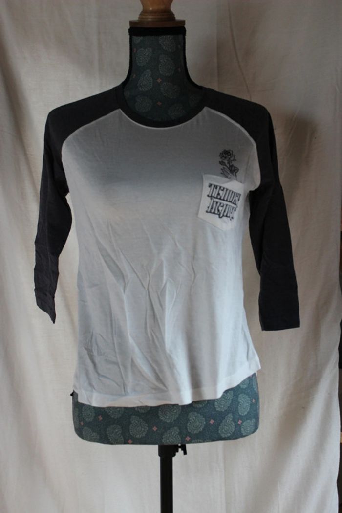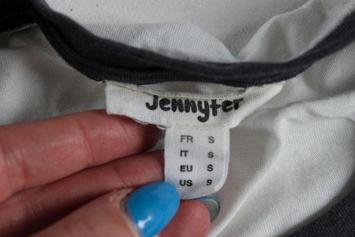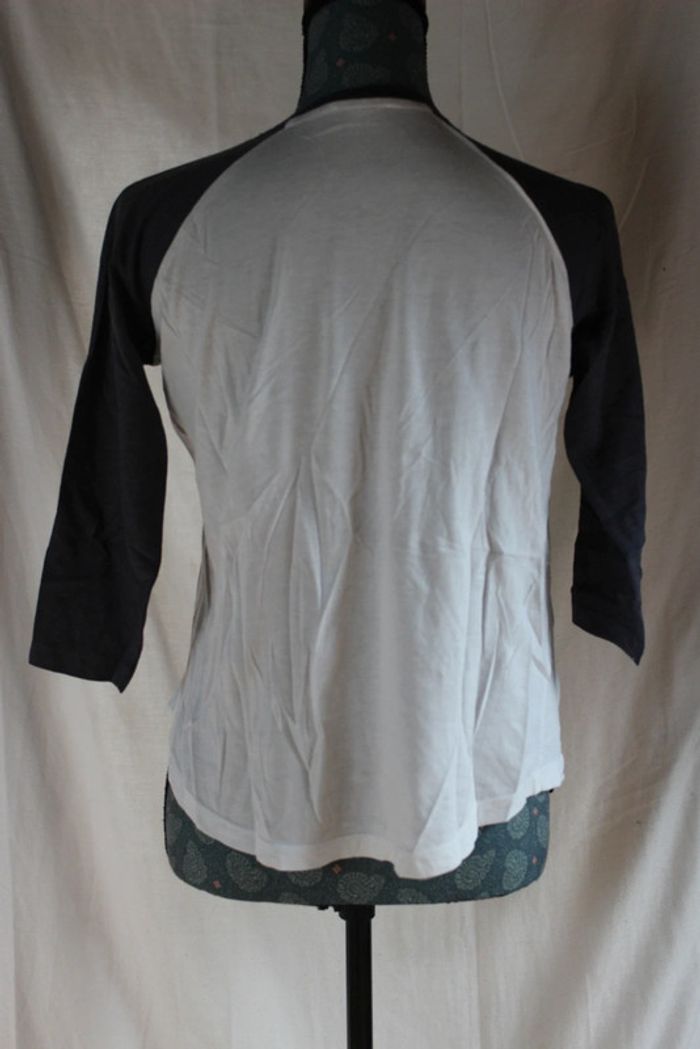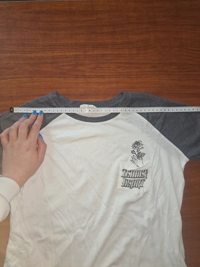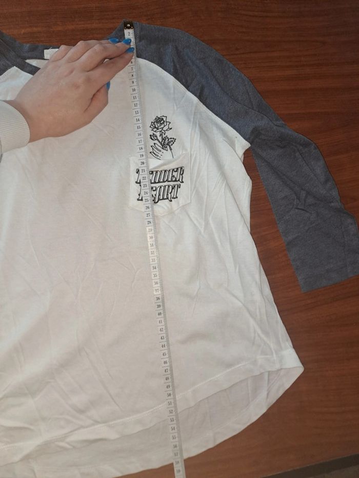 Haut manche ¾ Avec sur poche à l'avant un dessin Couleurs: blanc avec manche bleu Marque: Jennyfer Taille S Dimensions sur les dernières photos 50% coton 50% modal Porté plusieurs fois Tâches au niveau du devant et un jaunie voir 8 et 9eme photo #ellena50vêtementsfemmesTS #haut #hautfemme #jennyfer #hautmanchetroisquart