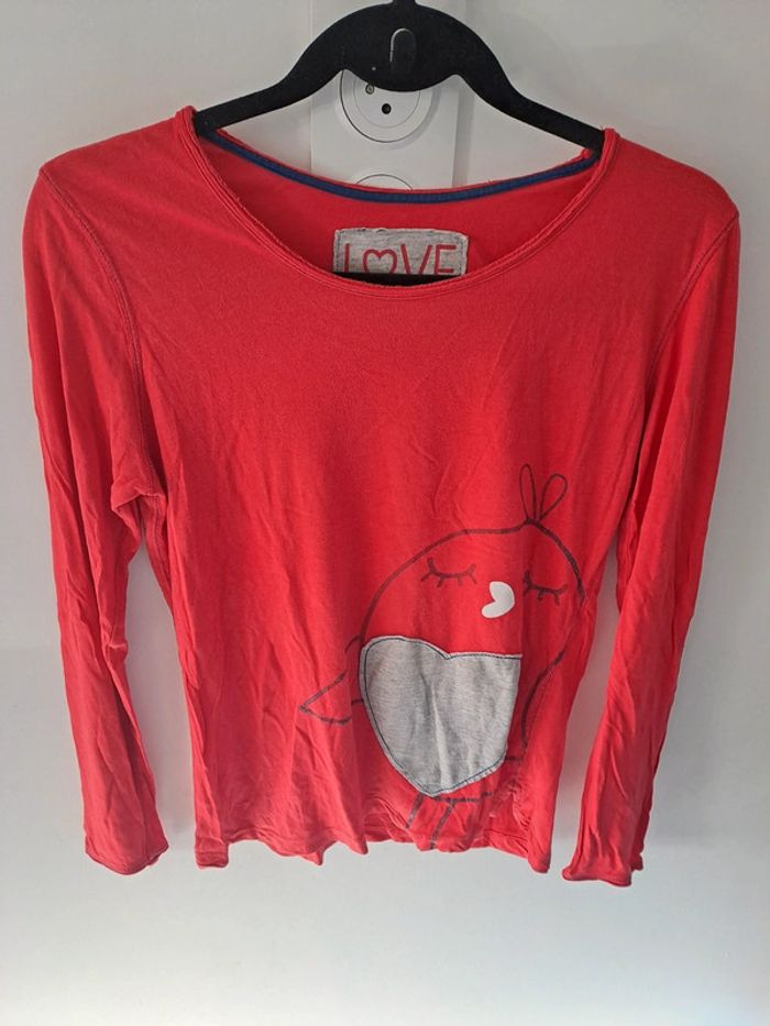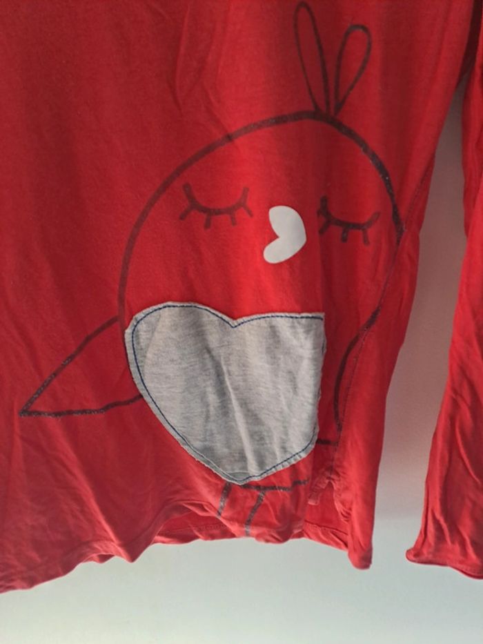 Haut de pyjama Avec dessin d'oiseau au niveau de l'avant Couleur: rouge Marque: Etam Taille S correct Porté plusieurs fois Contour bleu de l'oiseau usé #ellena50pyjama #ellena50vêtementsfemmesTS