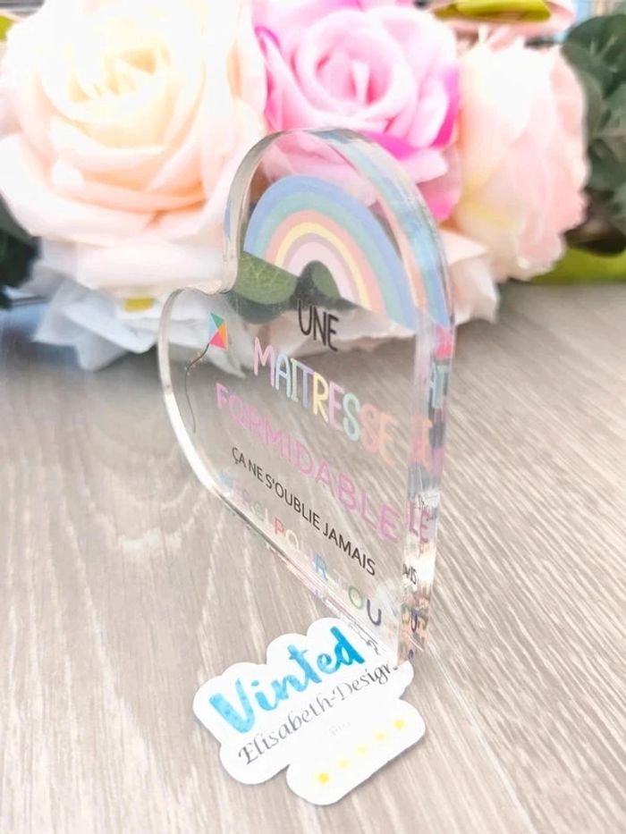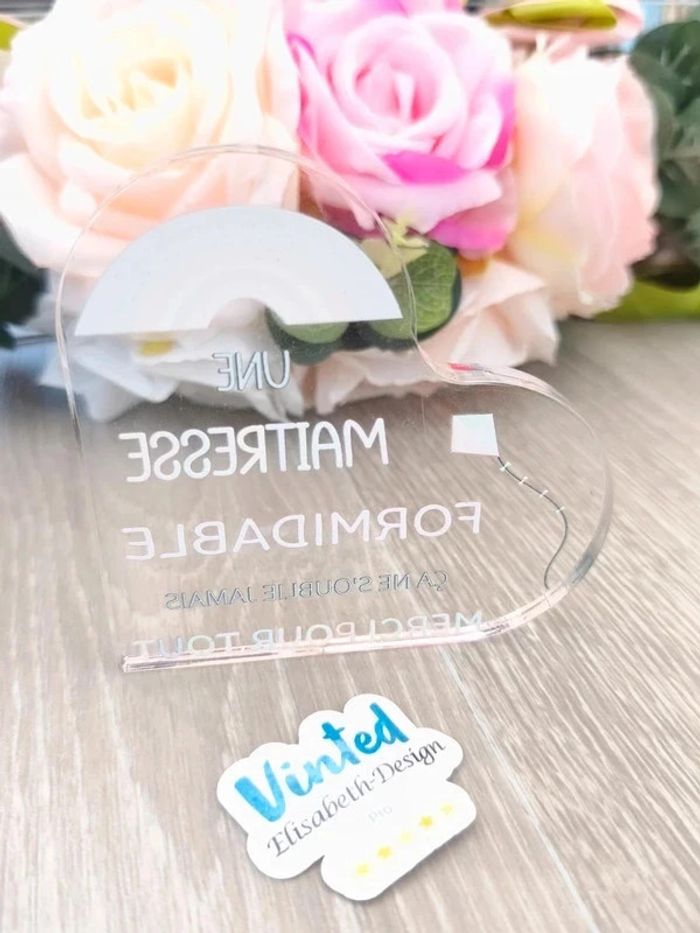📍Plaque neuve. 📍Plaque cœur " Maîtresse " 📍Plaque cadeau. 📍Plaque en acrylique de 1 cm d'épaisseur. 📍Taille : 10 x 9 cm. 👉Pour trouver d'autres activités c'est par ici : 🔎#elisabethdesignCadeau 📫⏳ Envoi rapide et soigné le jour même de l'achat dans la mesure du possible! 🤝 Frais de port ajusté au plus bas.