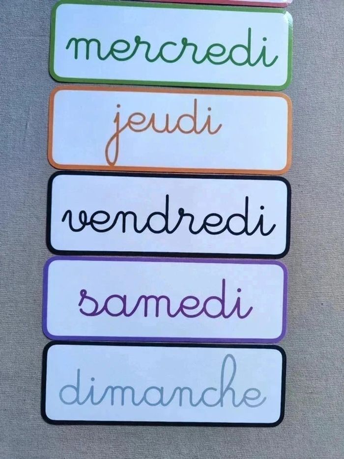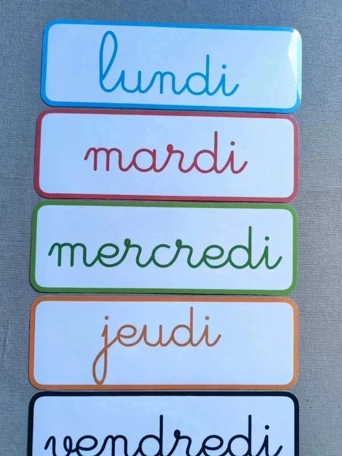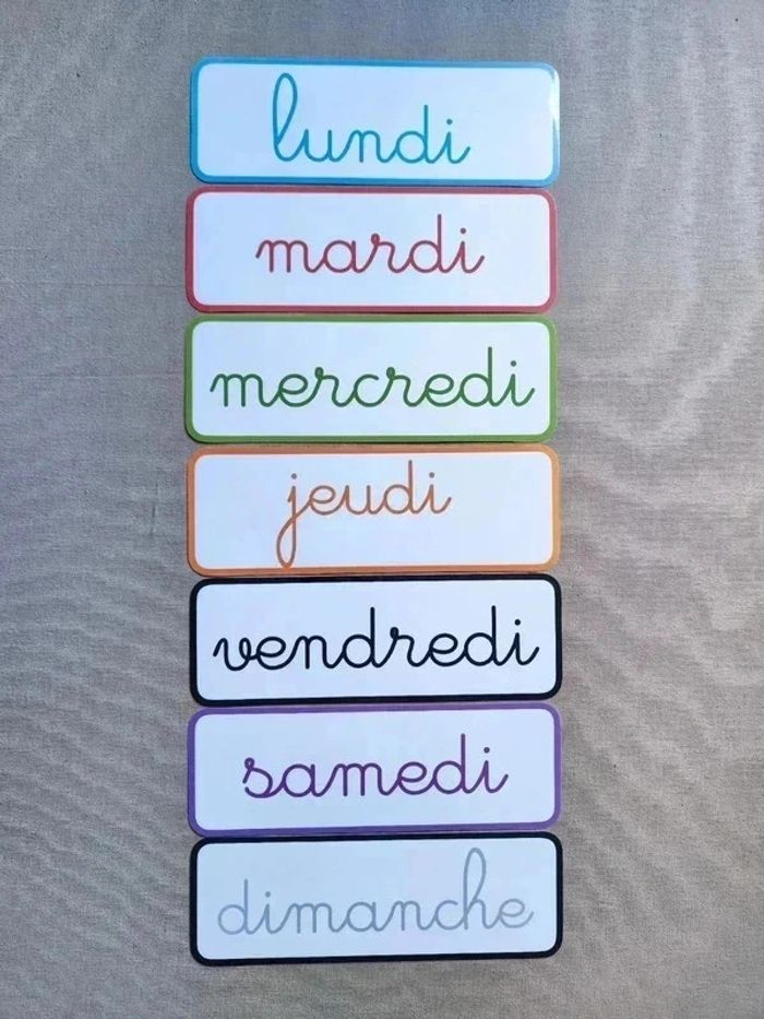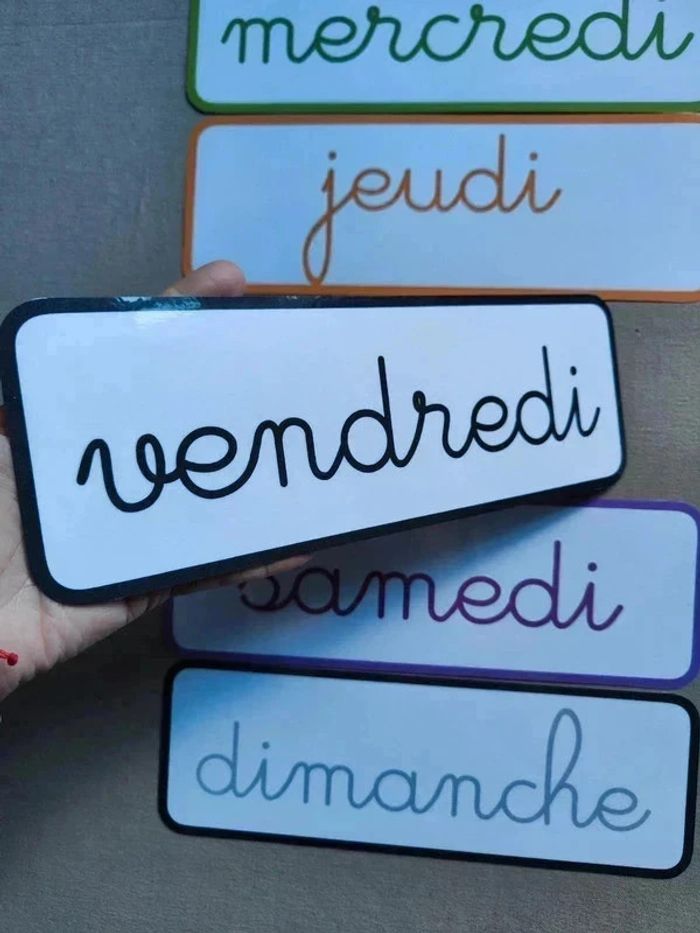 📍Pancartes des jours de la semaine, écriture cursive. 📍Papier 250G plastifié pour une bonne tenue ! 📍Taille : 28,5 x 10 cm 📍Neuf. 👉Pour trouver d'autres activités c'est par ici : 🔎#elisabethdesignAfficheA4 📫⏳ Envoi rapide et soigné le jour même de l'achat dans la mesure du possible! 🤝 Frais de port ajusté au plus bas. Ref:2#-Ephéméride