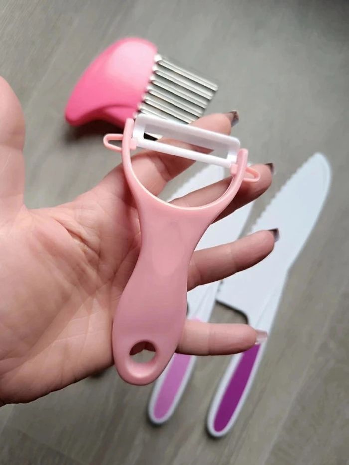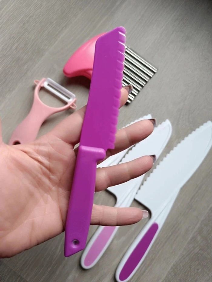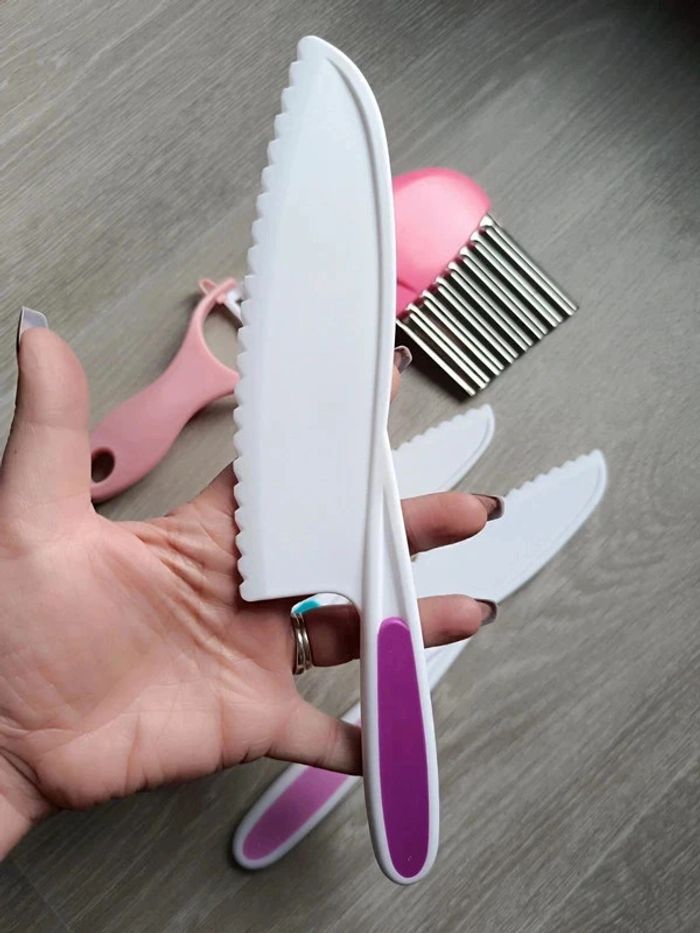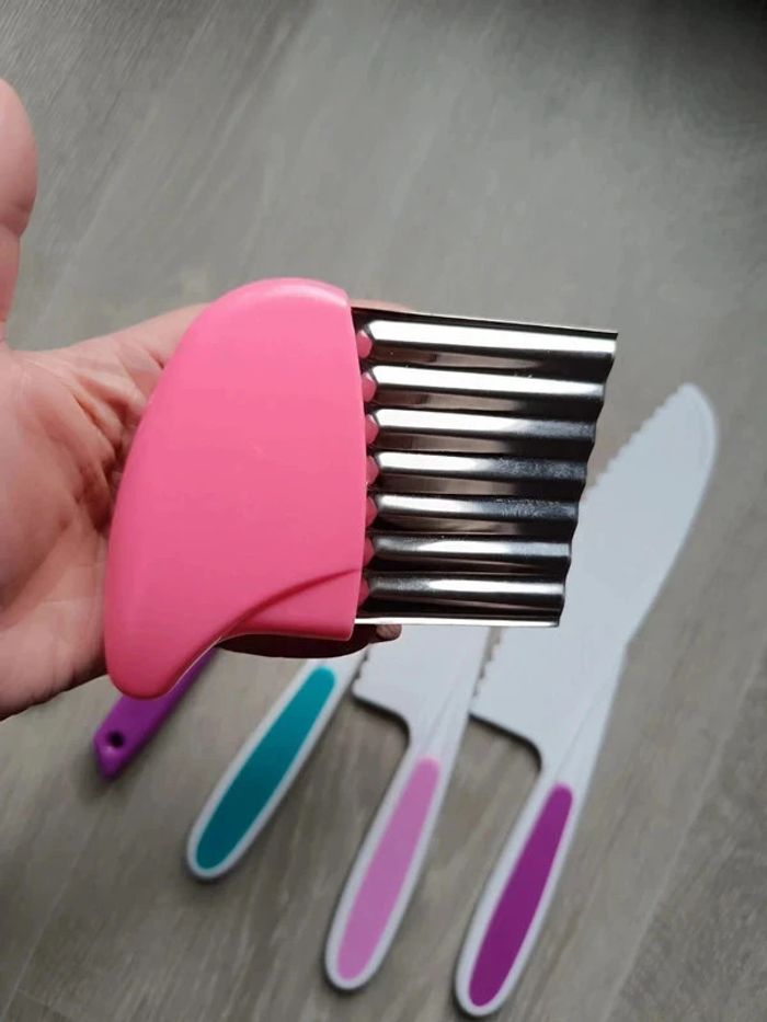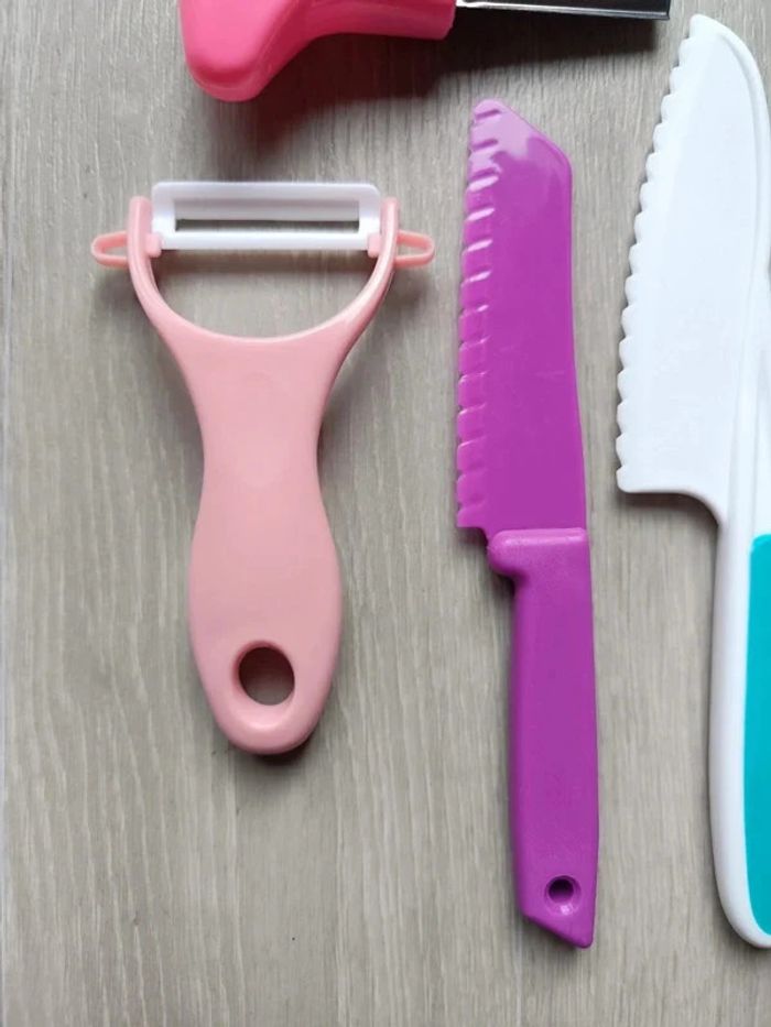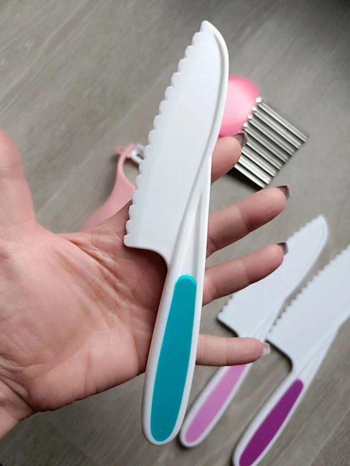 📍NEUF avec emballage. 📍Offrez à votre enfant la liberté de participer en cuisine avec vous de manière sûre et éducative avec cet ensemble de couteaux pour Enfant. 📍Coupe les aliments mais ne tranche pas la peau. 📍Apprentissage de la cuisine en famille. 📍Résistant aux chutes et aux chocs. 📍PLUS DE SÉCURITÉ : Ces couteaux adaptés aux enfants tranchent les aliments, mais ne coupe pas les doigts ! 📍ADAPTÉS : Trois tailles différentes pour s’adapter parfaitement à chaque âge et un couteau de paume en bois pour les tout-petits. 📍COMPLET : Tout le nécessaire pour couper, éplucher et façonner. 📍INDEPENDANCE : Augmente l’autonomie, développe la motricité fine et favorise la coordination main-oeil par l’apprentissage pratique de la cuisine. 📍Taille des 4 couteaux : -> 27,5 x 5 cm / 24,5 x 5 cm / 22 x 4 cm / 19,5 x 3 cm. 👉Pour trouver d'autres activités c'est par ici : 🔎#elisabethdesignCuisineEnfant 📫⏳ Envoi rapide et soigné le jour même de l'achat dans la mesure du possible! 🤝 Frais de port ajusté au plus bas. Dispo 1.