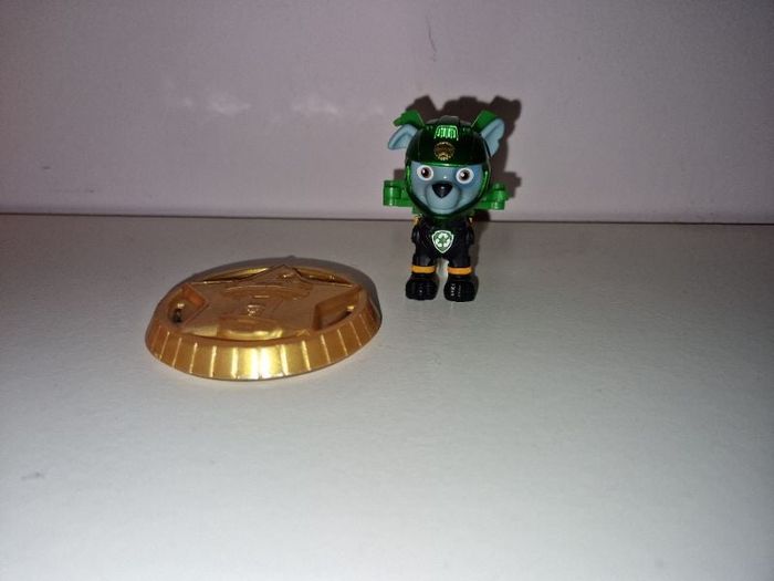 Paw patrol: Rocky avec son sac à dos qui se deploie lorsque lon appuie sur son collier! Rocky est un expert en recyclage. Très créatif, il a toujours des milliers d'idées qui bouillonne dans sa caboche de chien croisé. Appuyez sur le médaillon épinglé sur son poitrail et faites surgir des pinces de la boîte à outils fixée sur son dos. Comprend aussi un badge officiel d'expert en recyclage à accrocher à son tee-shirt. En vente en magasin à 10€45