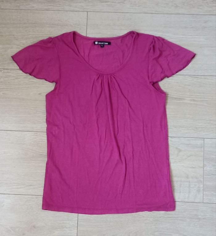 T shirt rose bonbon pour femme, marque U collection, taille 1. Grand trou pour les bras. Bon état, tissus légèrement bouloché.
