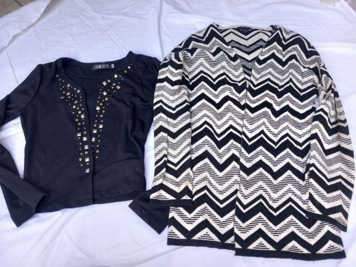En lot ou à l'unité 1 petites veste courte avec strass 2€ 1 gilet azteque noir et blanc 2€