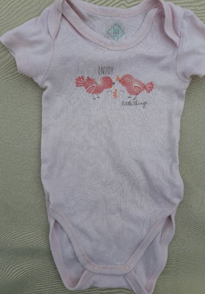 - 1 body rose avec motifs et inscription (oiseaux, "enjoy little things")