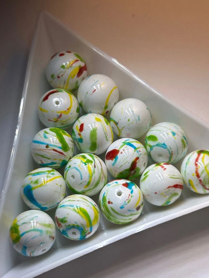 A390, 15 perles verre 10mm, blanches et dripping multicolore - photo numéro 1
