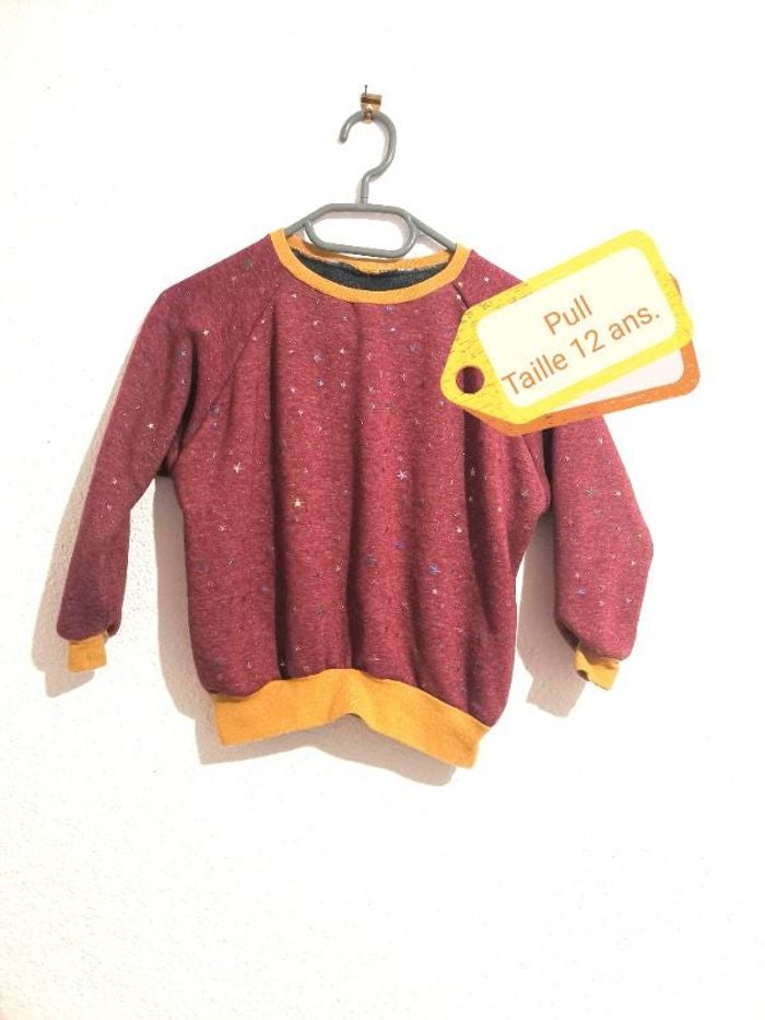 Pull, taille 12 ans. En très bon état comme neuf, pas de trous, pas de tâches. L'intérieur est doux et chaud. Les étoiles brillent et la couleur jaune a des effets pailettes. Couleur : bordeau, jaune Largeur : 50 cm Longueur : 43 cm