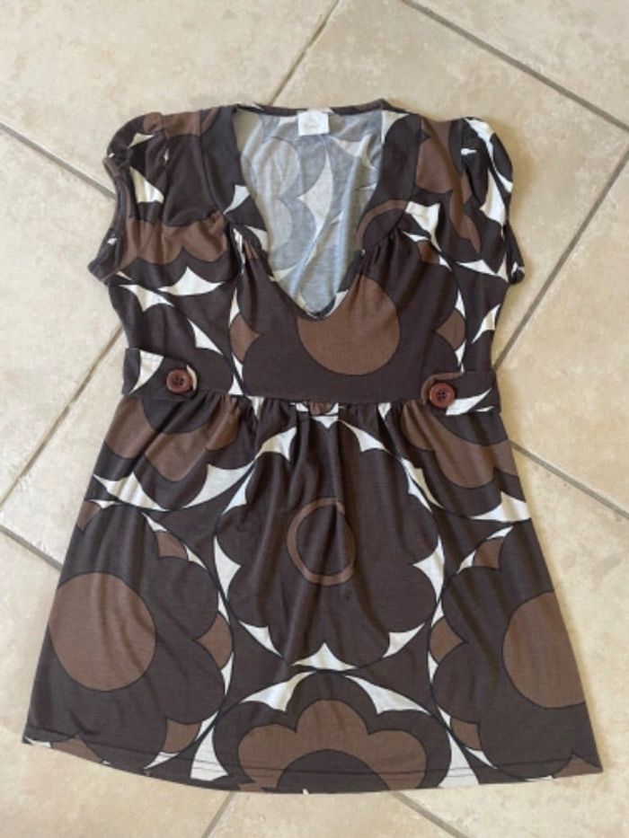 Manches courtes. Imprimé marron esprit vintage . Matière extensible