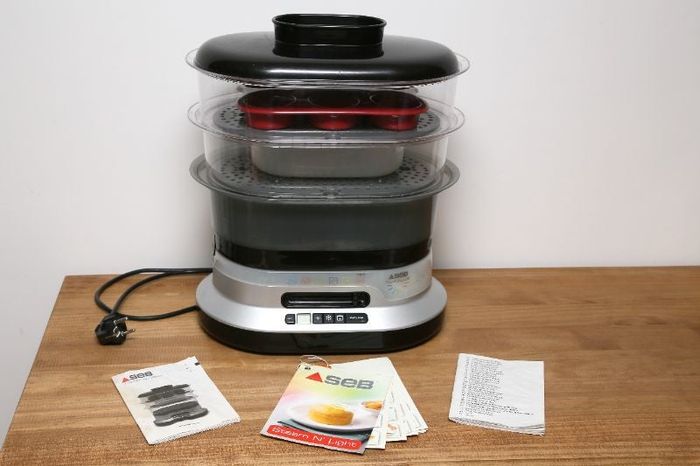 Cet appareil affiche une puissance de 900 W. Il propose 6 programmes de cuisson automatiques : légumes cuisson courte légumes cuisson longue poisson viande riz cake. Autre point très appréciable, il est livré avec plusieurs accessoires qui permettent de cuire plusieurs aliments ou plats différents en une seule fois. Le gain de temps est alors considérable. Il est rare de trouver une telle attention sur le marché des cuiseurs vapeur. La liste des accessoires disponibles : 3 bols en plastique avec grilles amovibles qui totalisent 10 litres un moule à cake un bol à riz d'une capacité de 700 ml un couvercle un bac récupérateur de jus. Un livre de recettes avec toutes sortes de plats salés et sucrés est également offert. Outre les 6 fonctions préprogrammées, 2 autres fonctionnalités enrichissent le panel de commande : la décongélation et le maintien au chaud. Bref, un appareil qui fait tout, ou presque !