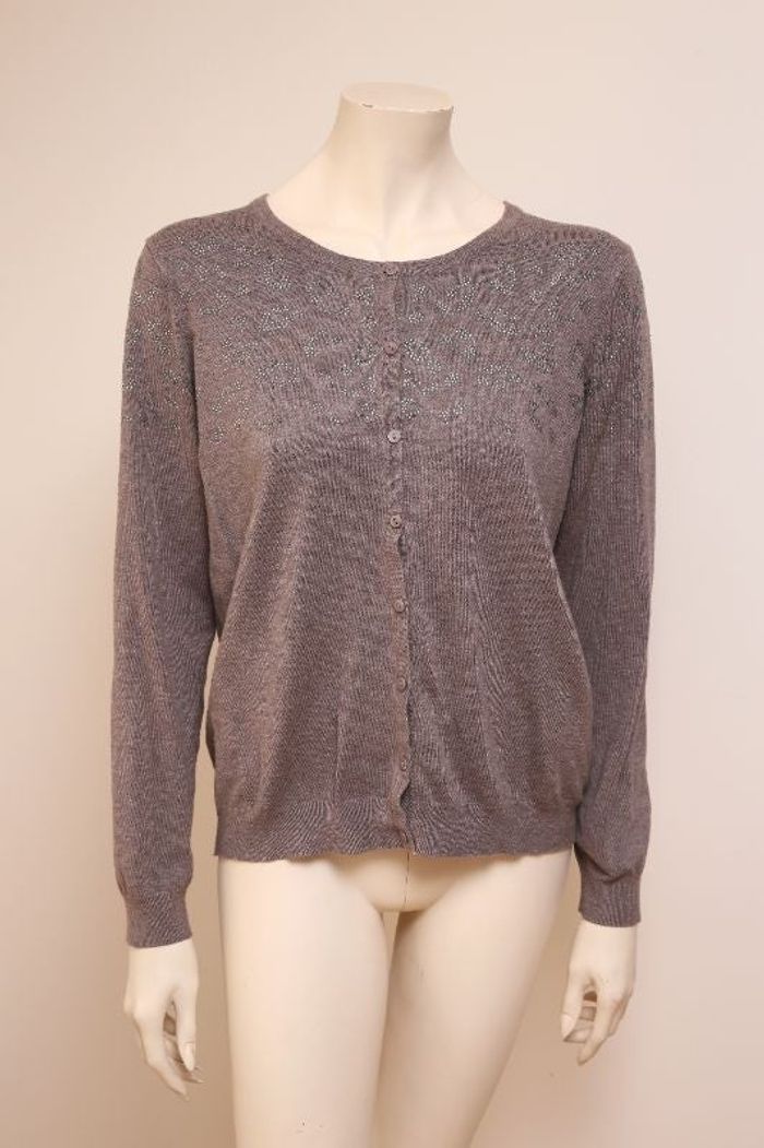 Taille 4 (sur le site de la marque semble correspondre à XL). Mesures épaule à épaule : 37cm, Aisselle à aisselle : 50cm, Du col au bas : 58cm Matière assez stretch. Des sequins se sont enfuis et laissent une marque noire à la place voire dernière photo.