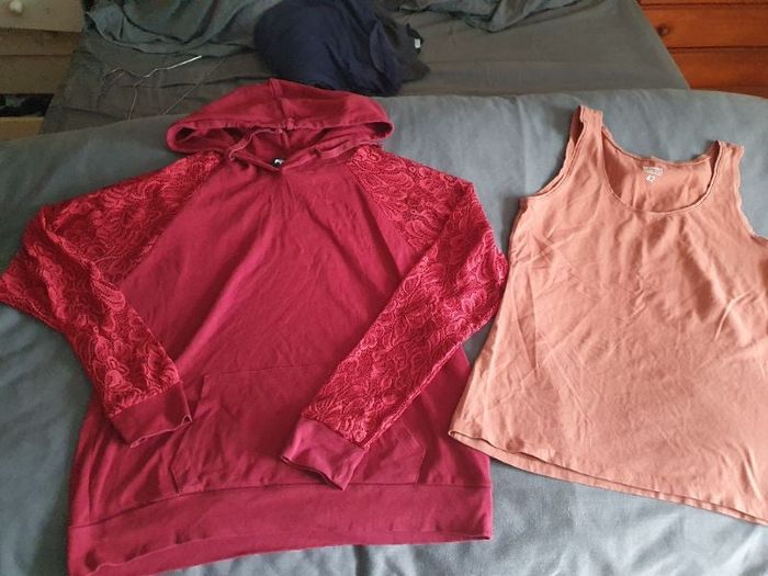 Lot composé d'un joli sweat à capuche avec manches en dentelle et d'un débardeur, très bon état, taille 42 Négociable N'hésitez pas à faire des lots et à me proposer vos prix