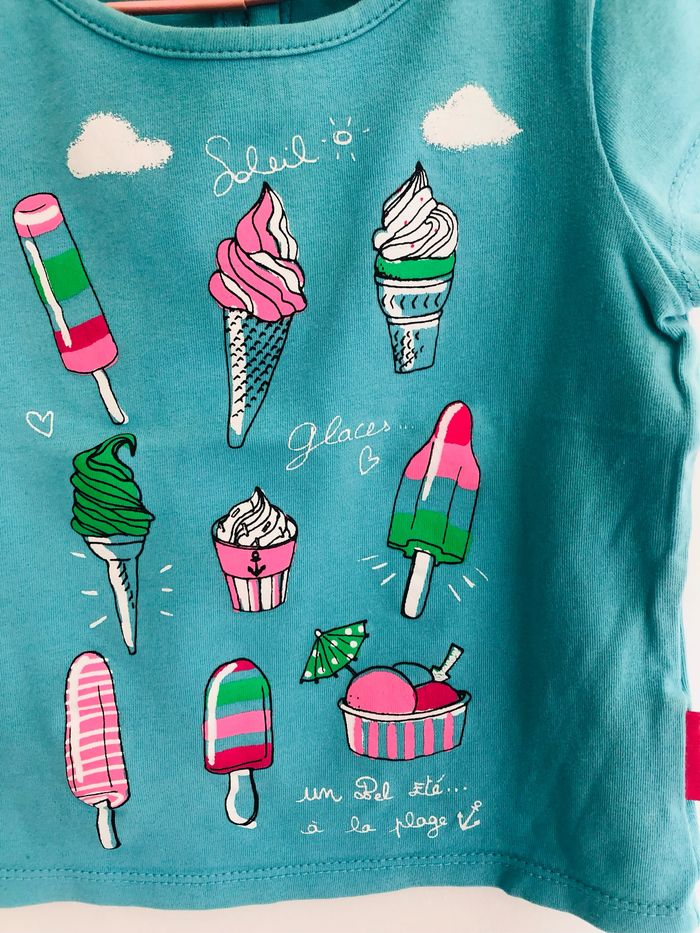 T-shirt dessin de glaces Marque: terre de marins taille 2 ans : 24 mois État: comme neuf, porté et lavé qu’une seule fois Boutons au dos pour un enfilage facile. Boutons de rechange en cas de perte sur l’étiquette intérieure. Mot clé: vêtement été bébé fille kawai rose girly kawaii vêtement été fille soleil plage mer vacances sable detente gelato esquimaux cornet Retrouvez tous les Vêtements 2 ans que je vends: #2ansmg