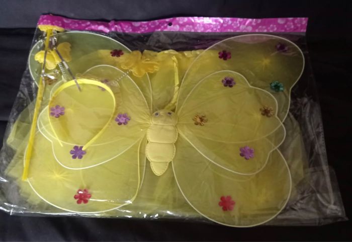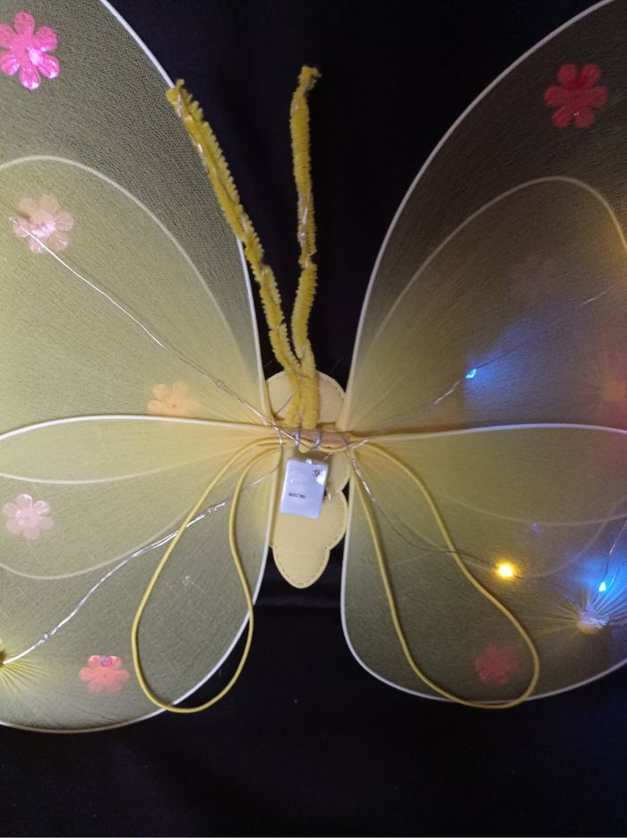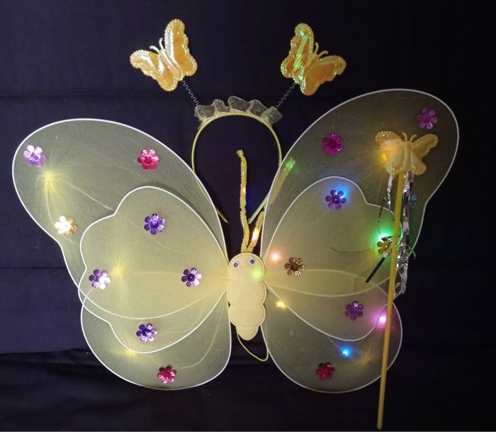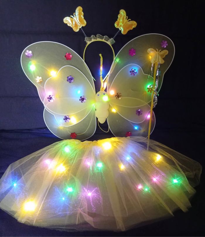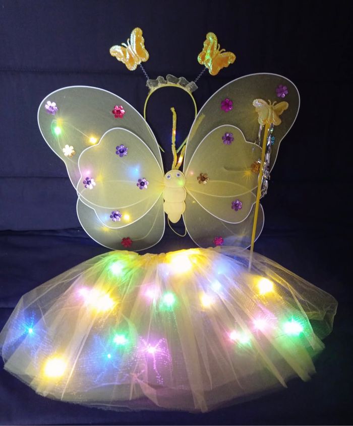 Déguisement papillon jaune à LED composé de 4 pièces, une jupe, les ailes de papillon (élastique à enfiler), une baguette et un serre tête. Jupe tutu élastique. Vendu neuf dans son emballage d’origine. Convient aux petites filles de 3-6ans. Expédition rapide après votre commande !