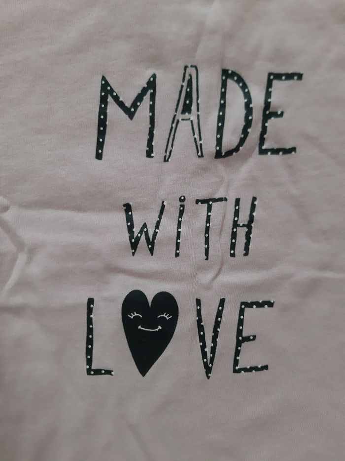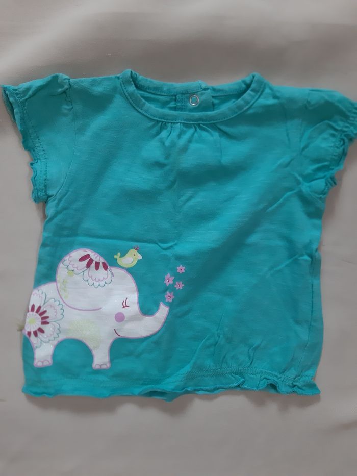 2 tee-shirts à manches courtes, en taille 6 mois - 1 tee-shirt vert, de la marque Gémo motifs : éléphant, oiseau, fleurs 3 boutons pressions dans le dos En très bon état. - 1 tee-shirt rose, de la marque Kiabi inscription : made with love 2 boutons sur l'épaule pour faciliter l'enfilage Je peux séparer les 2 tee-shirts sur demande. 1 € l'unité