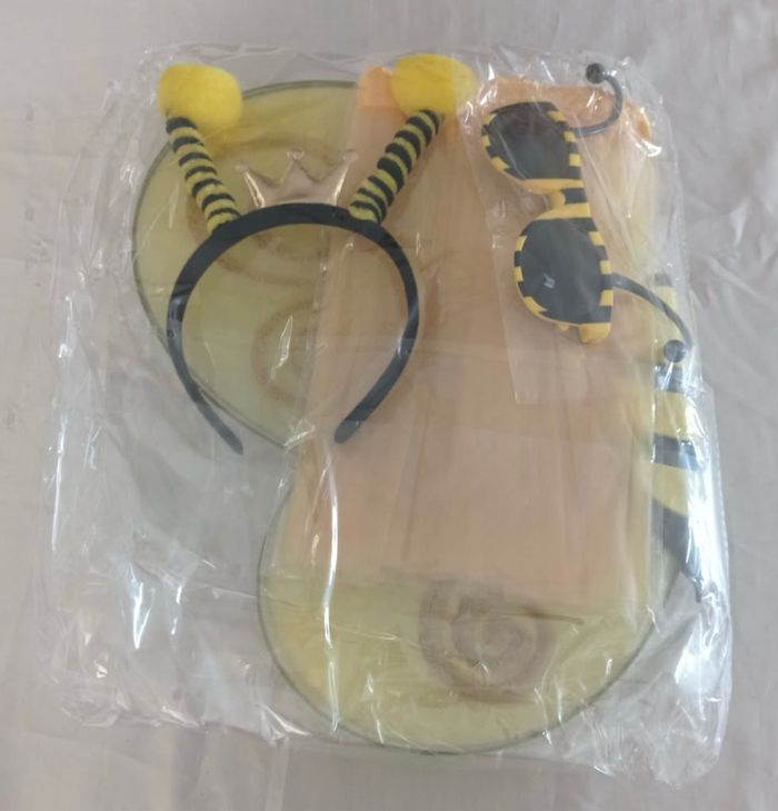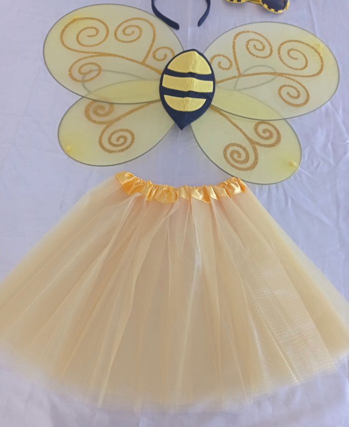 Deguisement abeille papillon composé d’une jupe élastique, d’un serre tête, d’une paire de lunette et des ailes (élastique à enfiler). Convient aux petites filles de 3-6ans. Vendu neuf dans son emballage d’origine. Envoi rapide