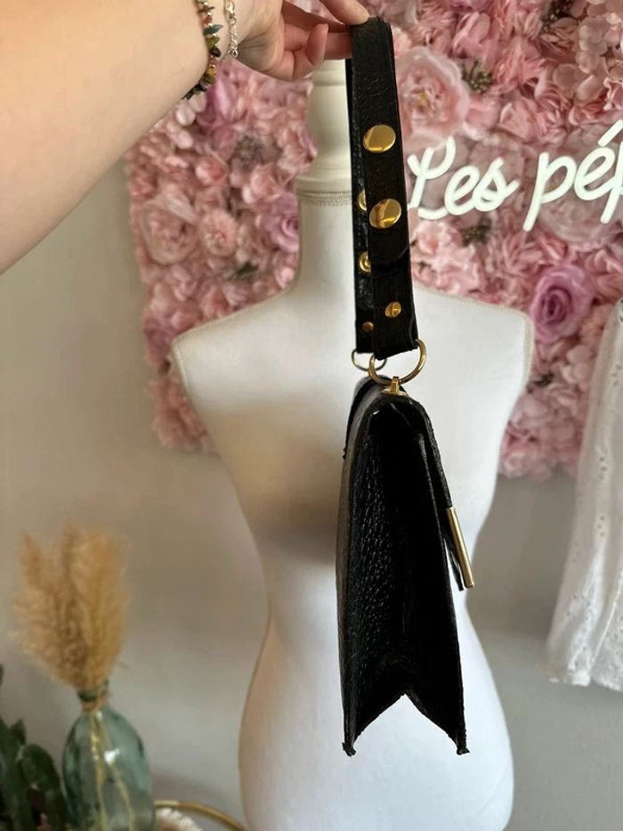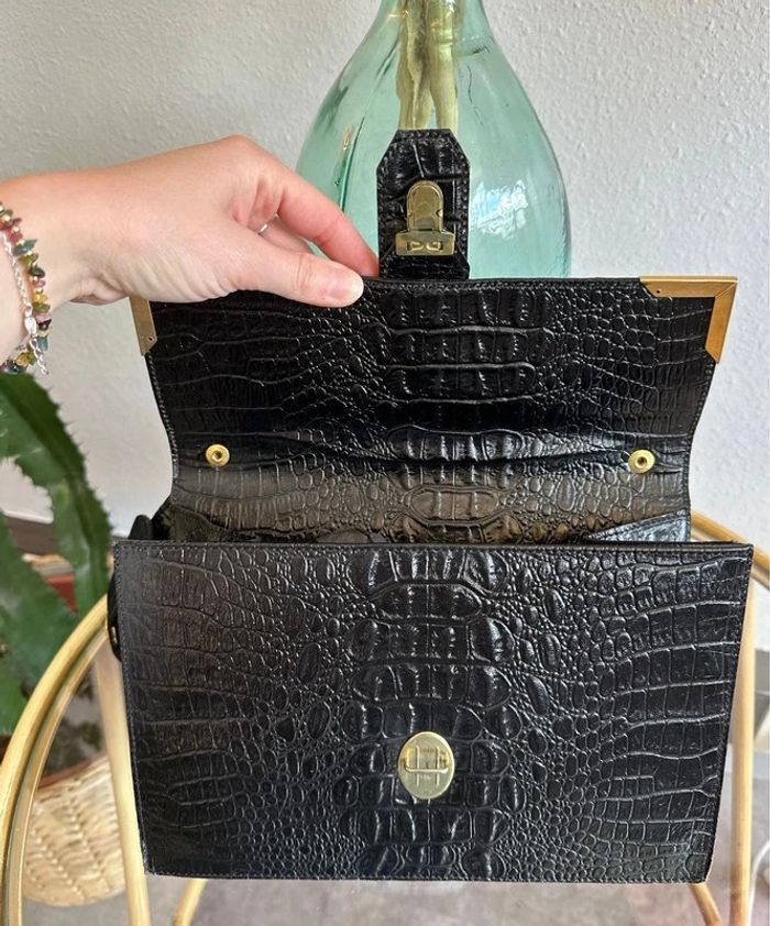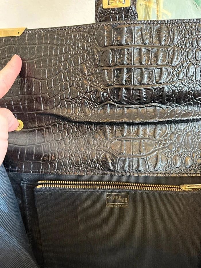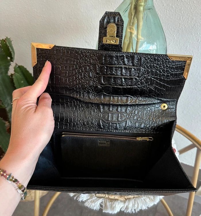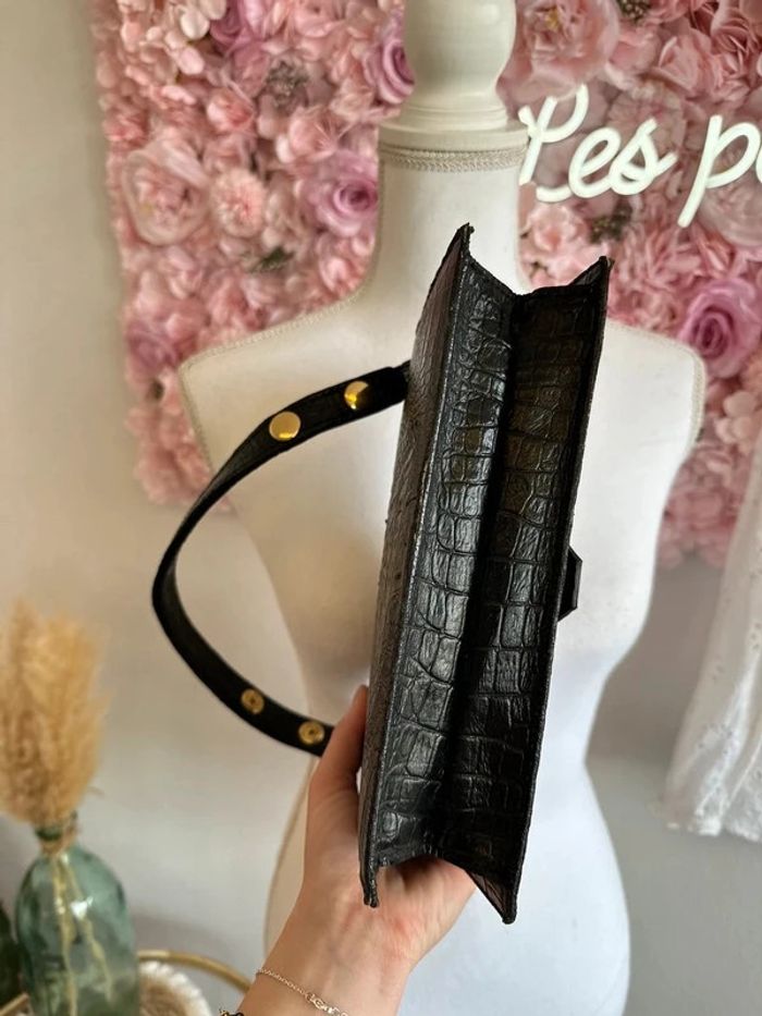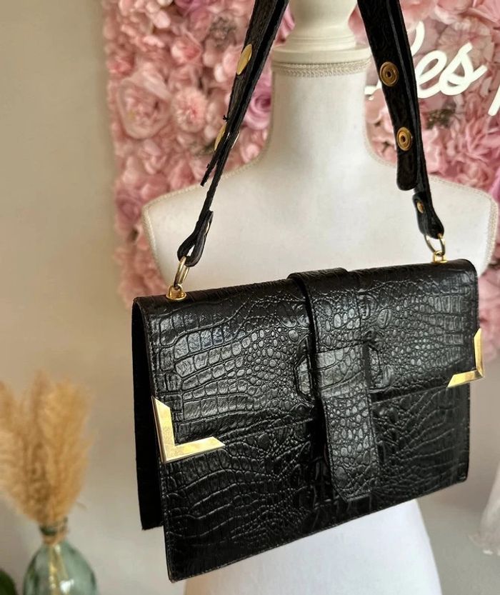 Ce superbe sac, en très bon état général avec peu de signes d'usure, est une véritable pièce vintage fabriquée en France, comme en témoigne sa qualité intemporelle. Doté d'une fermeture sur le devant et de détails dorés, il présente une couleur noire élégante en cuir croco. À l'intérieur, il dispose de poches pratiques pour organiser vos affaires. Une inscription discrète est présente à l'intérieur du sac. Mesurant environ 18,5 cm de hauteur, 25,5 cm de largeur et 7 cm de profondeur, ce sac est un accessoire classique qui ajoute une touche d'élégance à toute tenue.
