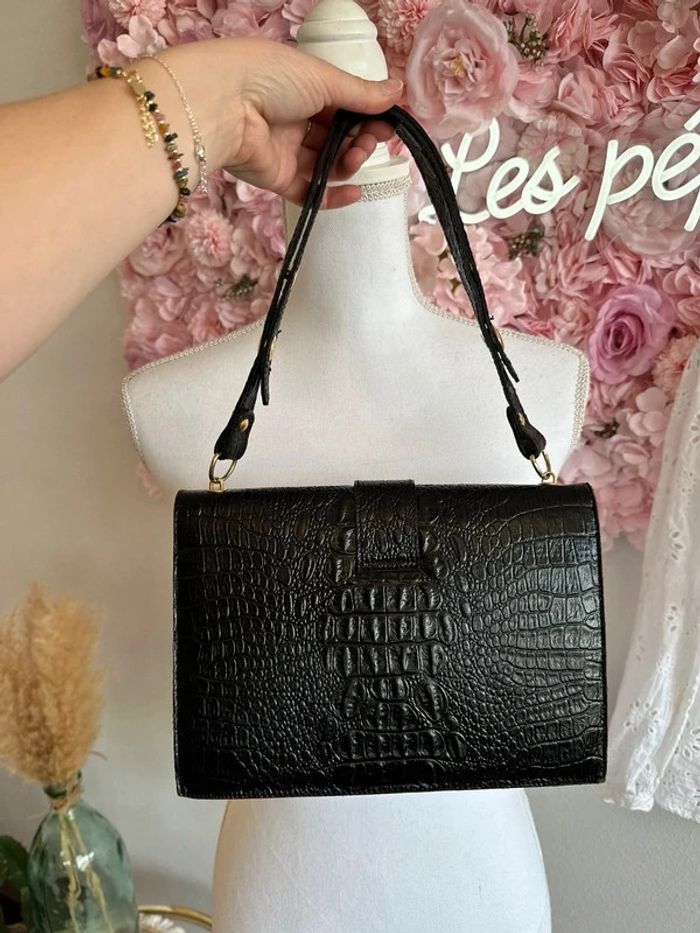 Sac porté épaule ou à main en cuir croco vintage, fabriqué en France