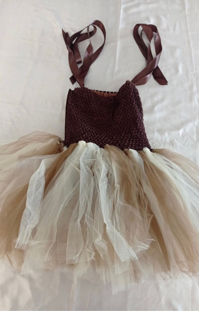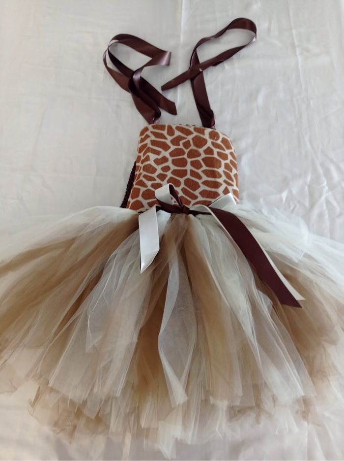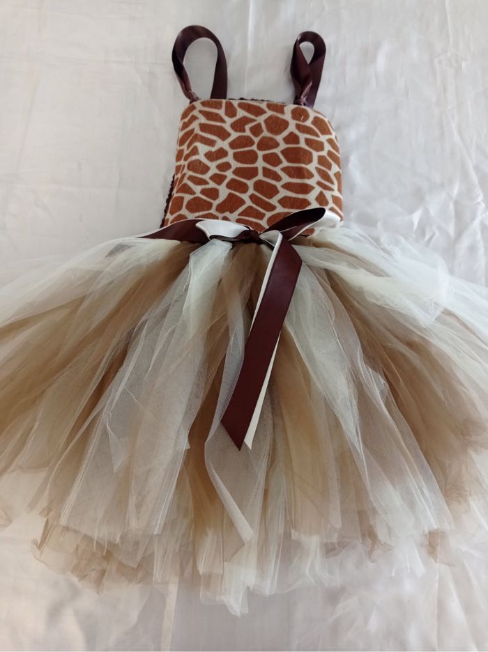 Déguisement robe tutu girafe et ces accessoires (noeud, serre tête, queue). La robe mesure 60cm de longueur, la taille convient aux petites filles de 4-5ans. Totalement neuve, vendue dans son emballage d’origine. Expédition rapide après votre commande