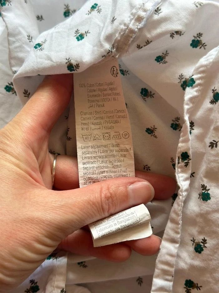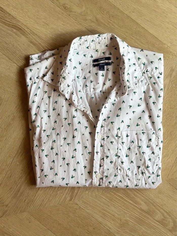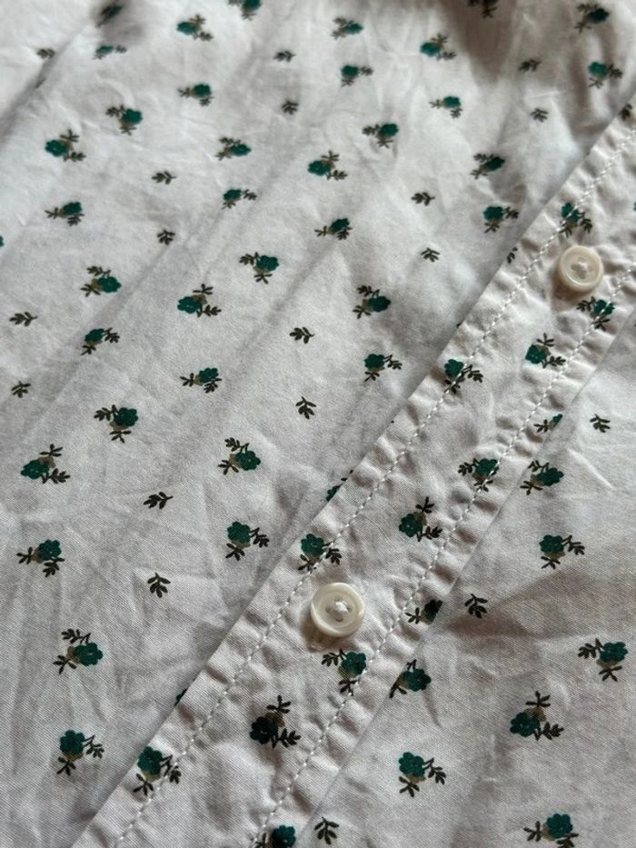 Belle chemise coupe slim, manches longues, blanche en coton avec de petits motifs fleuris très discrets et élégants dans les tons de verts. Elle est comme neuve. ℹ️ La taille S convient bien !
