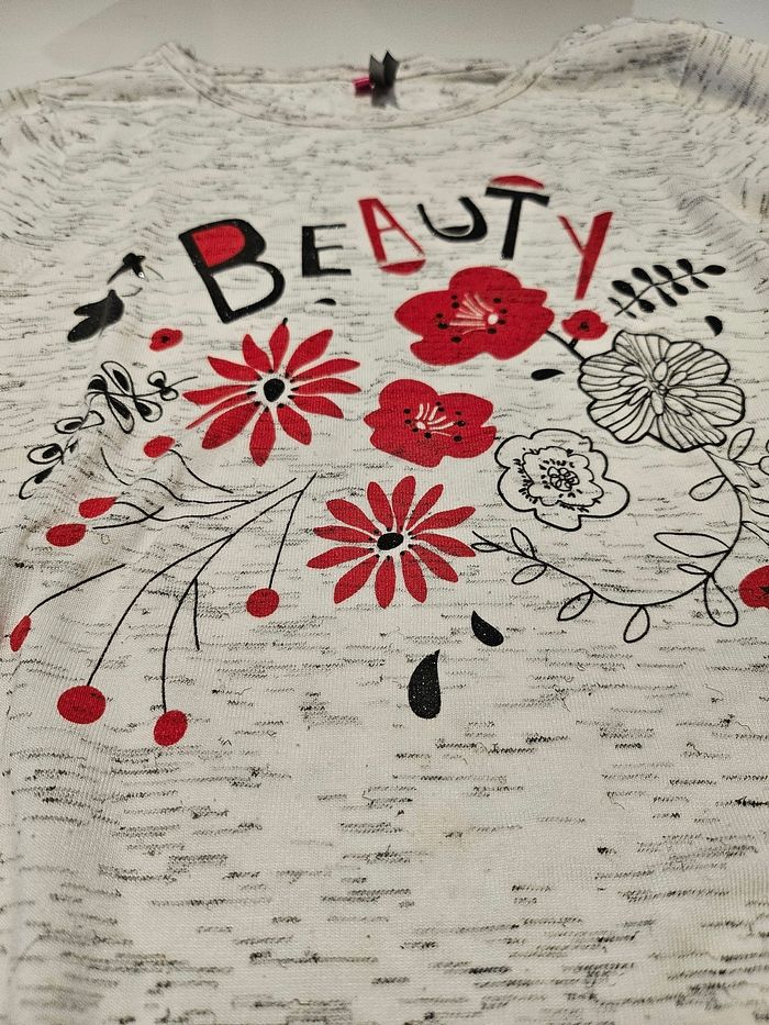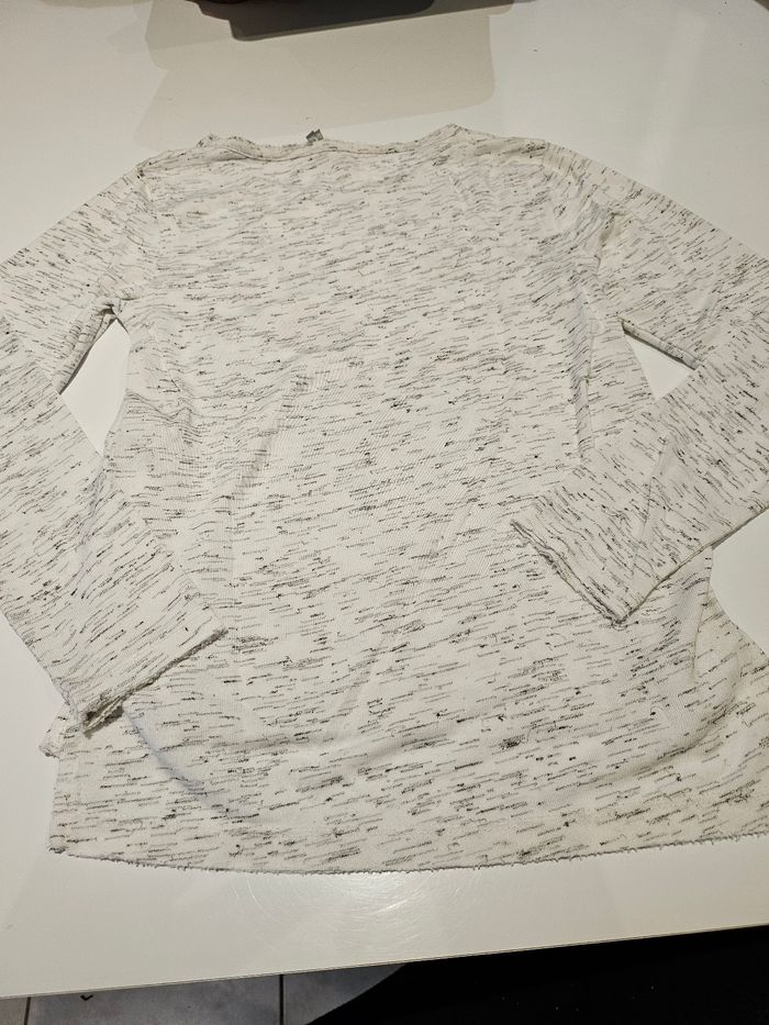 T-shirt manches longues gris chiné avec imprimés devant. Plus long derrière. Marque : Orchestra Taille : 8 ans