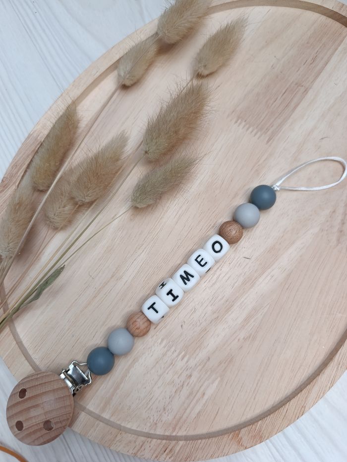 Attache tétine personnalisée Bois naturel et Silicone alimentaire Sans BPA ni autres substances toxiques Différents coloris possibles