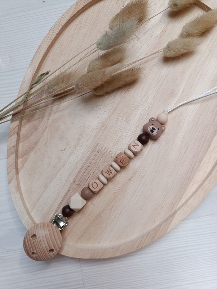 Attache tétine personnalisée Bois naturel et Silicone alimentaire Sans BPA ni autres substances toxiques Différents coloris possibles