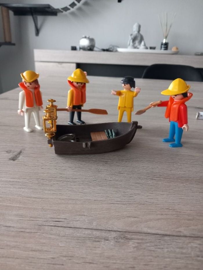 Playmobil anciens Playmobil anciens 4 personnages avec accessoires 3 Poissons 2 rames 2 assiettes (Je donne la barque avec car des éléments sont manquants/ cassés) En tres bon état
