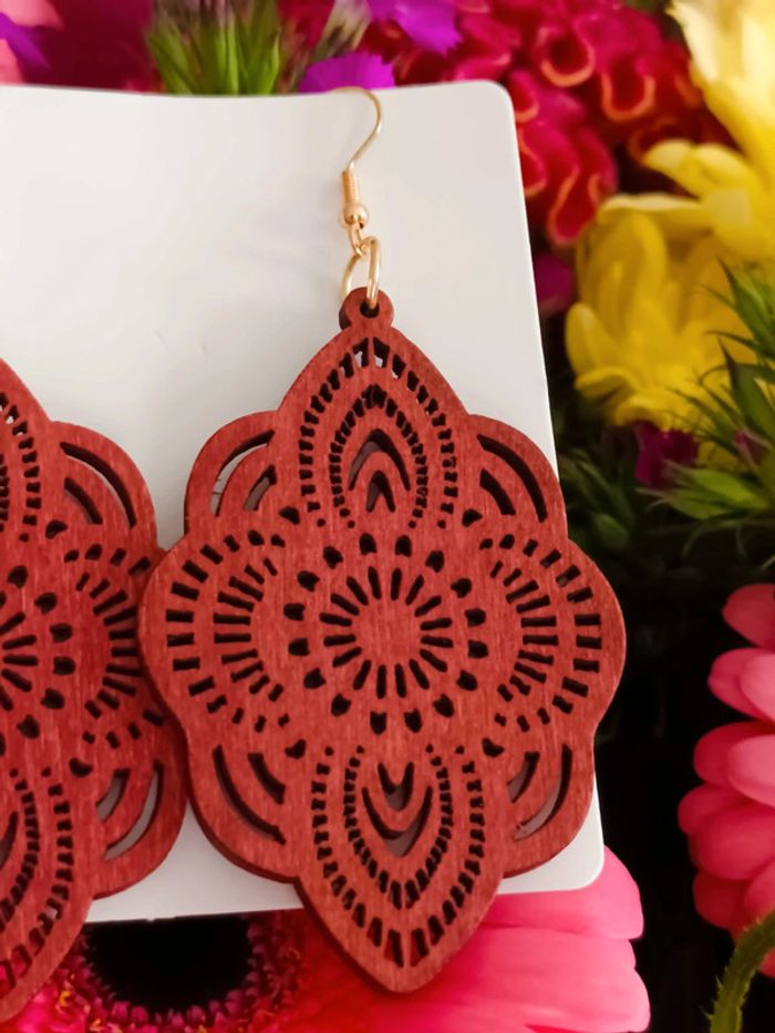 Superbes boucles d’oreilles bois couleur bordeaux effet mandala. 💎 Légères,féminines et très tendance, elles apporteront une touche chic à toutes tes tenues, du quotidien aux occasions spéciales. Hauteur 8 cm 🌸 En parfait état, jamais portées. 📦 Envoi rapide et soigné #bouclesdoreilles #bijouxfemme #lookbohème #bijouxtendance