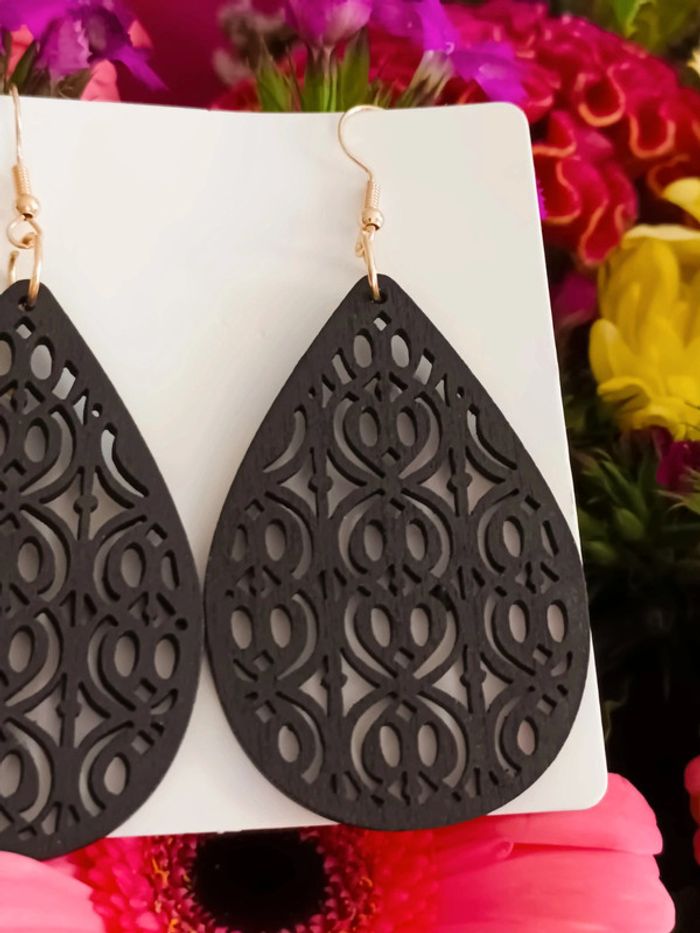 Superbes boucles d’oreilles bois couleur noir. 💎 Légères,féminines et très tendance, elles apporteront une touche chic à toutes tes tenues, du quotidien aux occasions spéciales. Hauteur 8 cm 🌸 En parfait état, jamais portées. 📦 Envoi rapide et soigné #bouclesdoreilles #bijouxfemme #lookbohème #bijouxtendance