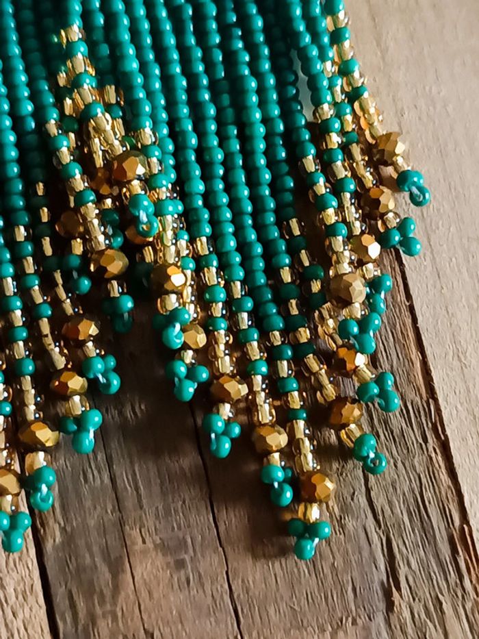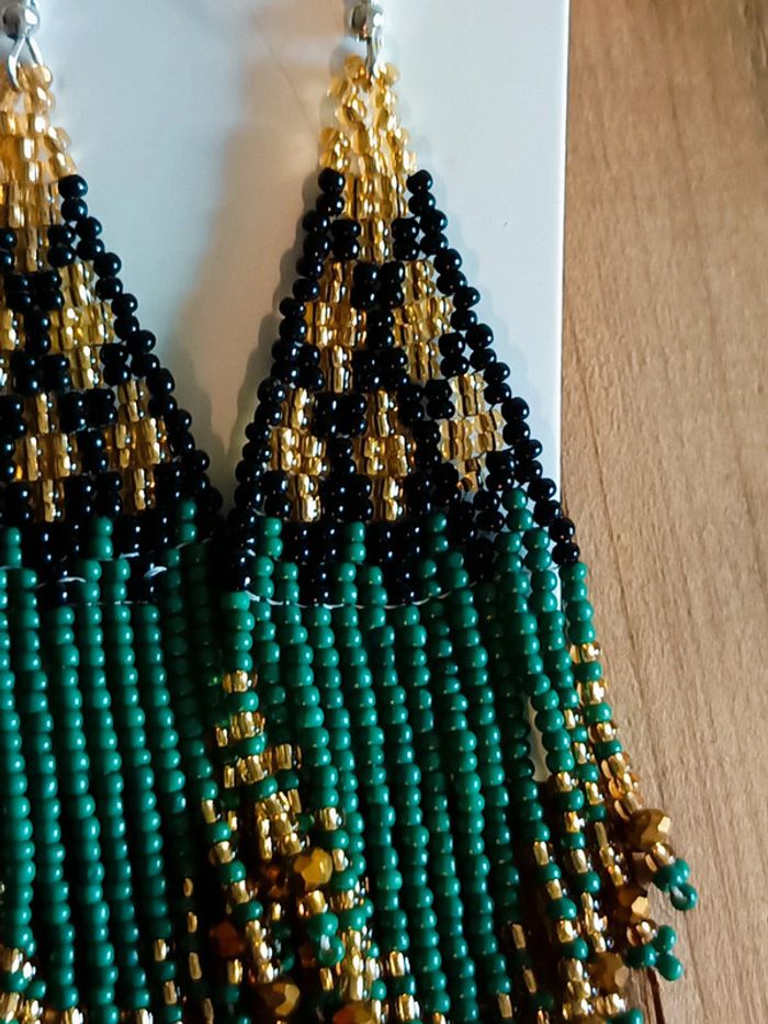 Sublimes boucles d’oreilles pendantes entièrement faites de perles colorées : vert, doré et noir Motifs ethniques et look bohème chic, parfaites pour égayer toutes vos tenues d’été ☀️ Neuves 💡 Légères et agréables à porter 📏 Longueur approx. : 10 cm 📦 Envoi rapide et soigné #bouclesdoreilles #bohème #ethnique #bijouxfantaisie #été #coloré