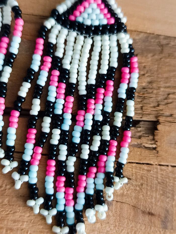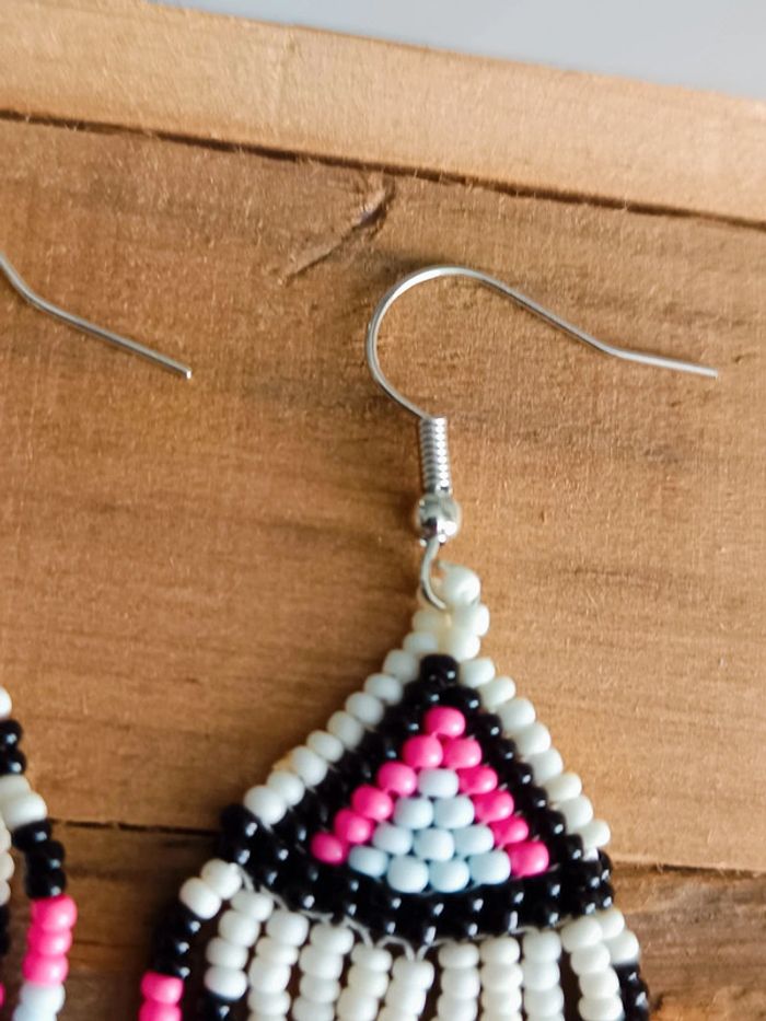 Sublimes boucles d’oreilles pendantes entièrement faites de perles colorées : rose, turquoise, blanc et noir. Motifs ethniques et look bohème chic, parfaites pour égayer toutes vos tenues d’été ☀️ Neuves 💡 Légères et agréables à porter 📏 Longueur approx. : 8 cm 📦 Envoi rapide et soigné #bouclesdoreilles #bohème #ethnique #bijouxfantaisie #été #coloré