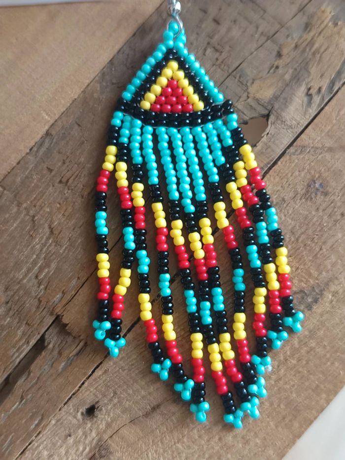 Sublimes boucles d’oreilles pendantes entièrement faites de perles colorées : turquoise, jaune, rouge et noir. Motifs ethniques et look bohème chic, parfaites pour égayer toutes vos tenues d’été ☀️ Neuves 💡 Légères et agréables à porter 📏 Longueur approx. : 8 cm 📦 Envoi rapide et soigné #bouclesdoreilles #bohème #ethnique #bijouxfantaisie #été #coloré