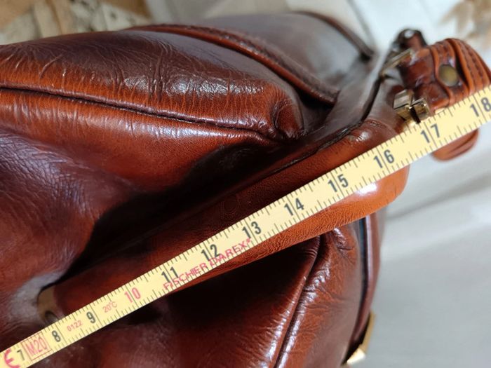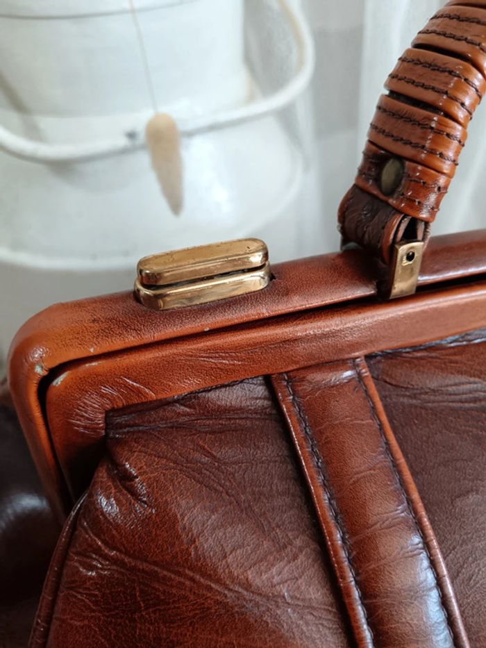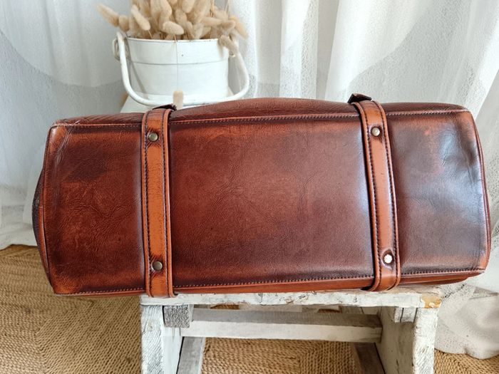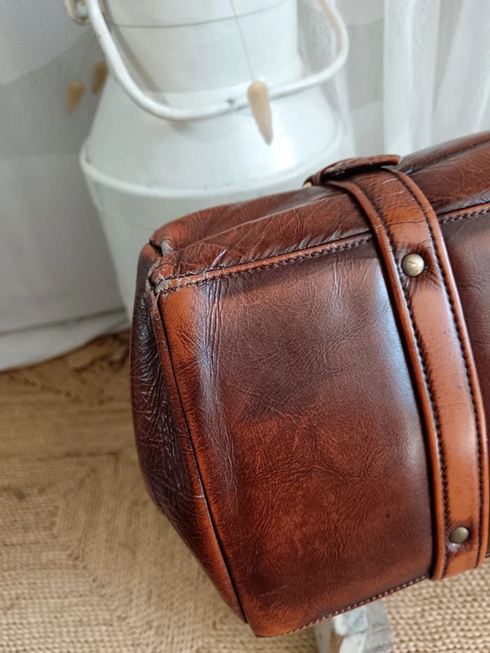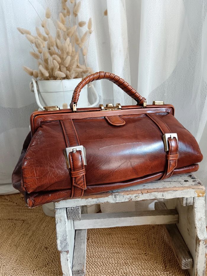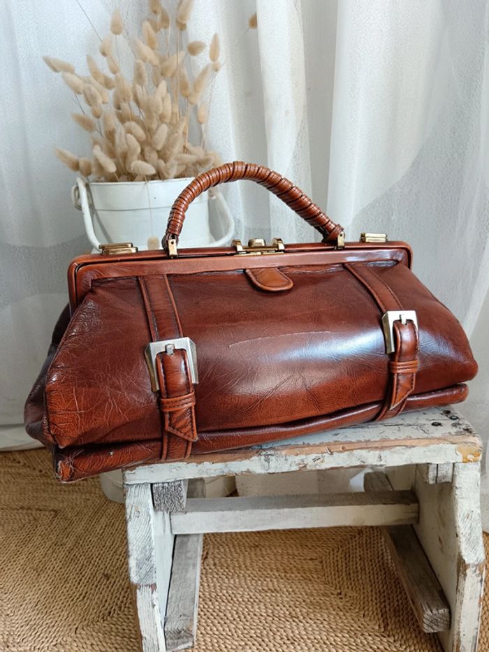 Sac de médecin vintage par P. P. Fouguy. En cuir lisse cognac de qualité. Il a traversé des décennies, malgré sa griffe sur le devant, il est en très bon état. La griffe peut être estompée par un cirage ton sur ton, ou bien un petit passage chez un bon cordonnier. 2 systèmes de fermeture, tout d'abord latéral avec des loquets a débloquer, puis centrale en kisslock. Fournis avec la clé d'origine incorporé à la anse. Estimé années 70. Mesures en photos. #calmsac #sacmedecinvintage #saccochemedecin #sacvintage