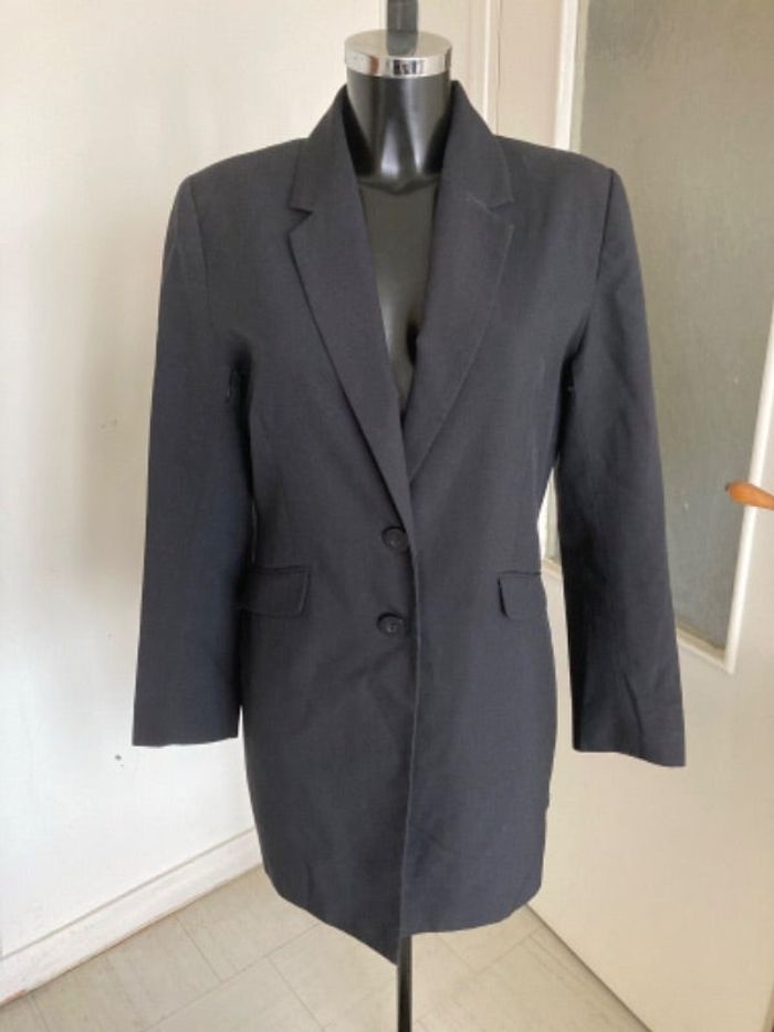 Long blazer tendance Taille 38/M, il n’y a pas d’étiquette de taille En très bon état mais il est décousu sur quelques centimètres sous chaque aisselle et un fil est tiré