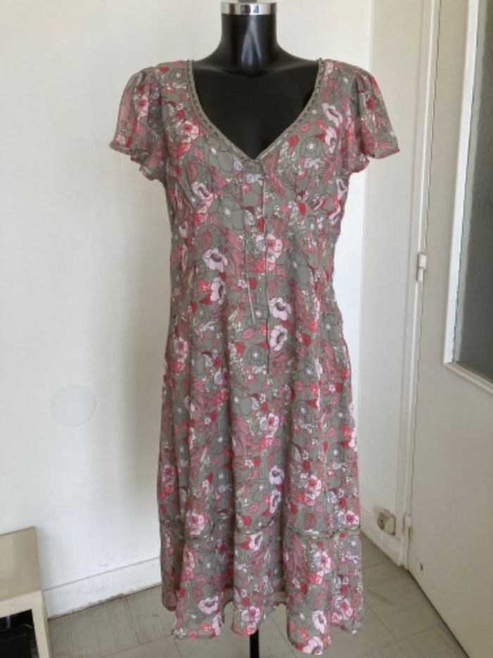 Robe fleurie Marque H&M Taille 40/42, étiquetté 46 mais je trouve qu’elle taille vraiment petit Elle est présentée sur un mannequin taille 36/38 N’hésitez pas à demander des mesures pour être sur que ça vous convient En très bon état