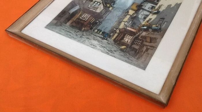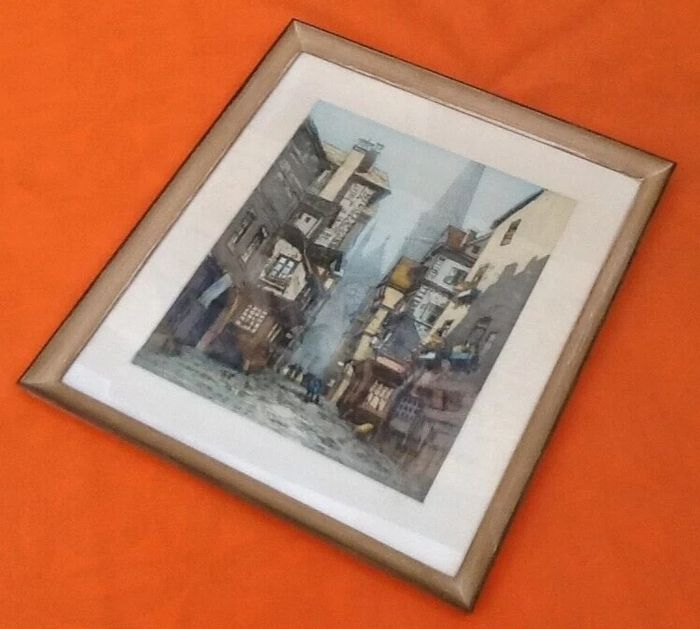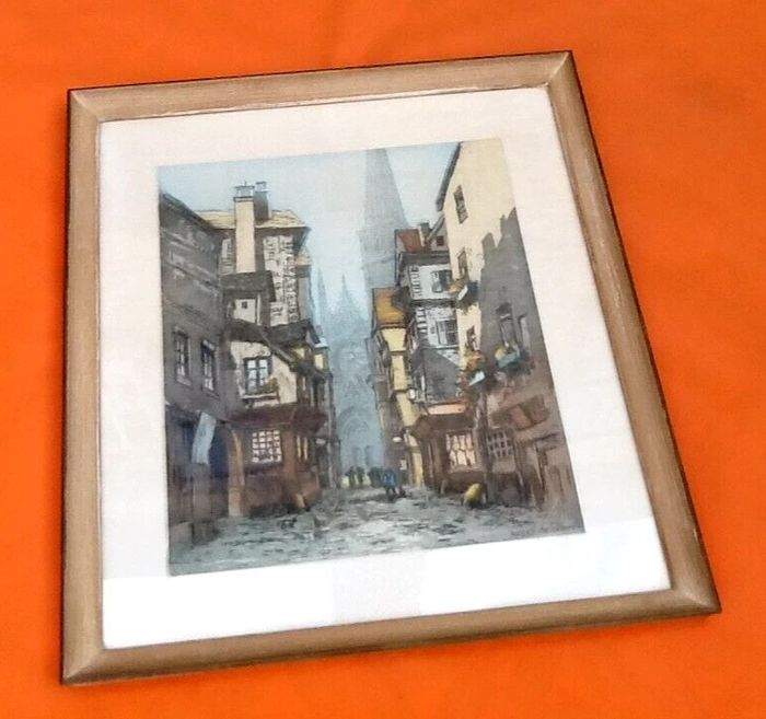 Legarf (Lucien Veder) Eau-forte colorée (grand format) Rouen (Seine-Maritime) Rue de l' Epicerie Gravure (430x350)mm Encadrement bois et sous verre (605x525x28)mm Poids : 2Kg300 Lucien VEDER (1902-1978) artiste français graveur imprimeur d' Art. Fils de Eugène-Louis VEDER (1876-1936) peintre aquarelliste graveur. Lucien VEDER apprit les techniques de la gravure dans l' atelier de son père à chatillon (Hauts-de-Seine).