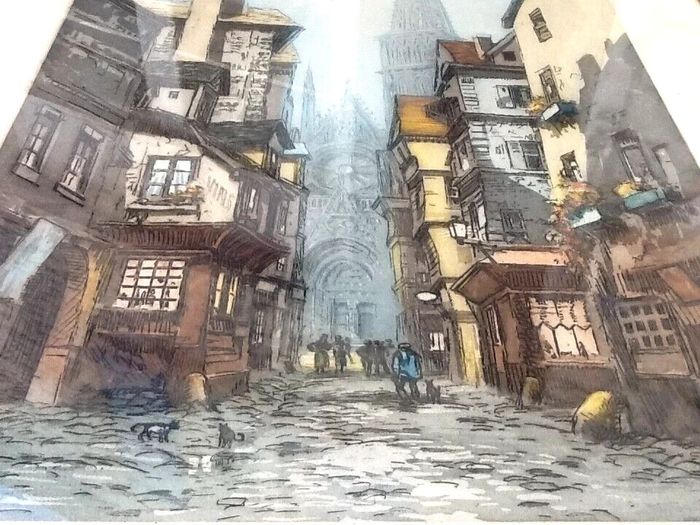Legarf (Lucien Veder) Eau-forte colorée Rouen Rue de l' Epicerie