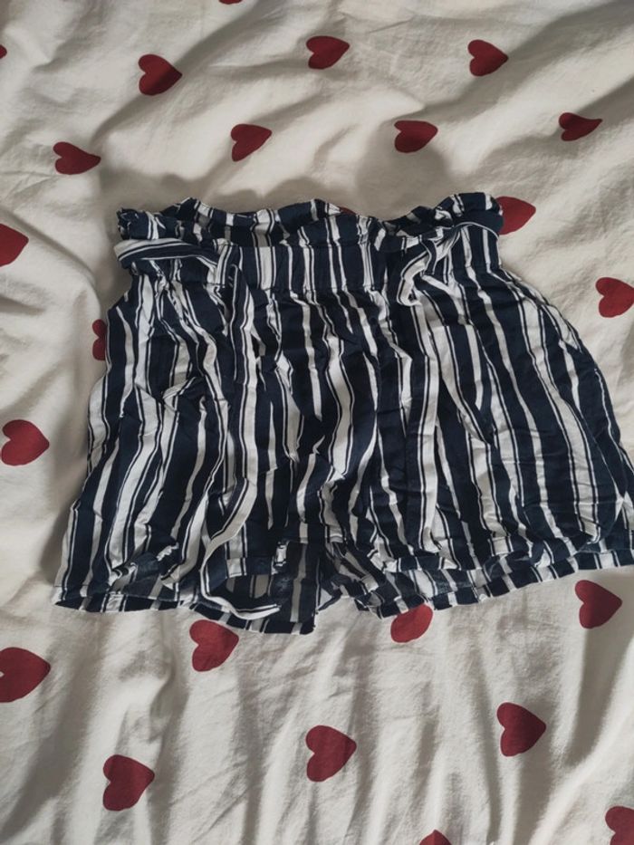 Short d'été a rayures bleu foncé et blanc avec ceinture.
