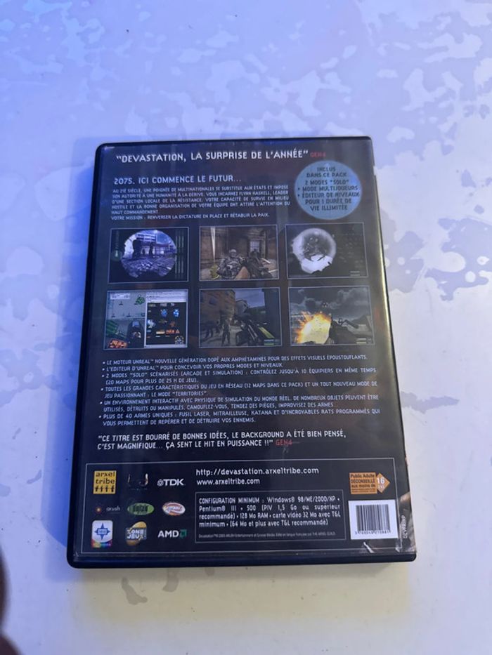 Affrontez une dictature futuriste dans Devastation, un jeu de tir à la première personne nerveux et immersif, propulsé par l’Unreal Engine nouvelle génération ! Contenu du pack : • CD original avec quelques micro-rayures (testé et fonctionnel) • Boîtier d’origine en bon état • Livret complet inclus Langue : Français Éditeur : Arxel Tribe / TDK Année : 2003 État général : Bon état – micro-rayures présentes mais n’affectant pas la lecture du jeu Un incontournable pour les amateurs de FPS rétro et de jeux cyberpunk. Une pièce parfaite pour les collectionneurs ou les passionnés de jeux PC des années 2000. Envoi rapide et soigné. ⸻ #JeuPC #FPSRetro #Devastation #UnrealEngine #JeuxVidéoVintage #Rétrogaming #BoîtierComplet #CDTesté #MicroRayures #JeuFonctionnel #GamingPC #ArxelTribe #CollectionJeuxPC