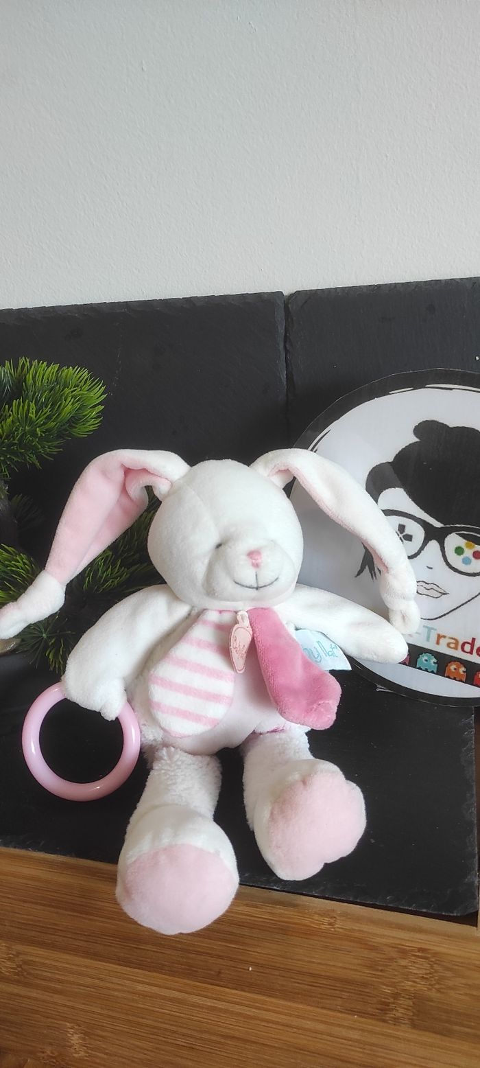 Doudou lapin blanc rose layette hochet anneau pouet Baby Nat bn0102 Peluche Rayé - photo numéro 1