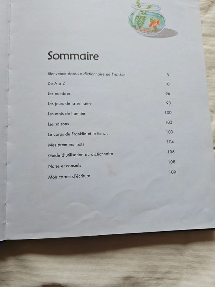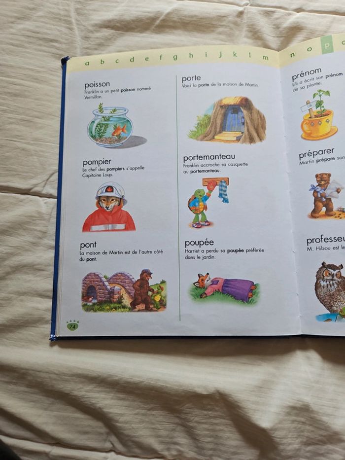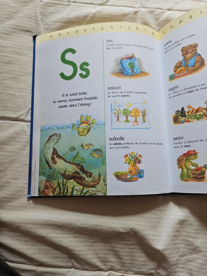 Apprendre des mots avec Franklin, mots illustrés et mis en contexte dans une phrase Possibilité de tracer les lettres en fin de livre, mais elles sont déjà faites au crayon de papier Les coins du livre sont abîmés au niveau de la couverture #livresjeunessecenatco