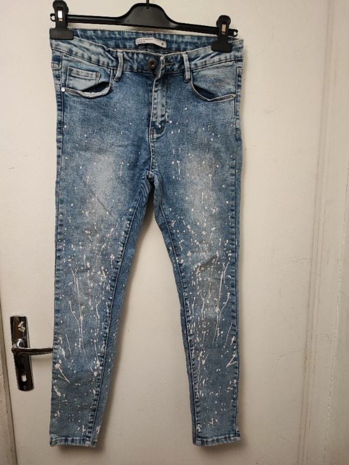 Superbe jean femme (laulia) Coupe droite Imprimé tache de peinture Taille haute Étiquette 38 Coloris bleu délavé