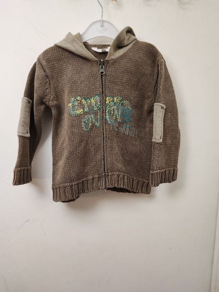 Superbe gilet bébé garçon (kidnai) Vintage A capuche Grosse maille coton Motifs fils vieilli Empiècement sur les bras Taille 24 mois