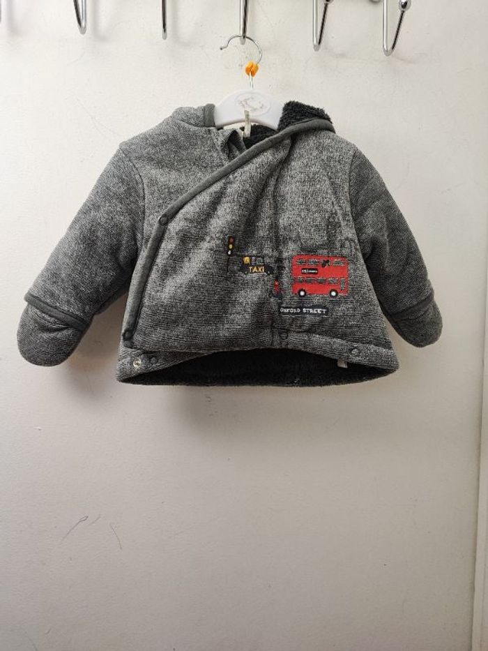 Beau blouson bébé Séparable peut se porter avec un bas Bouton pression a cet effet Petites moufles intégrées Intérieur fourré polaire Zip plus boutons pression Taille 3 mois Coloris gris Idéale grand froid