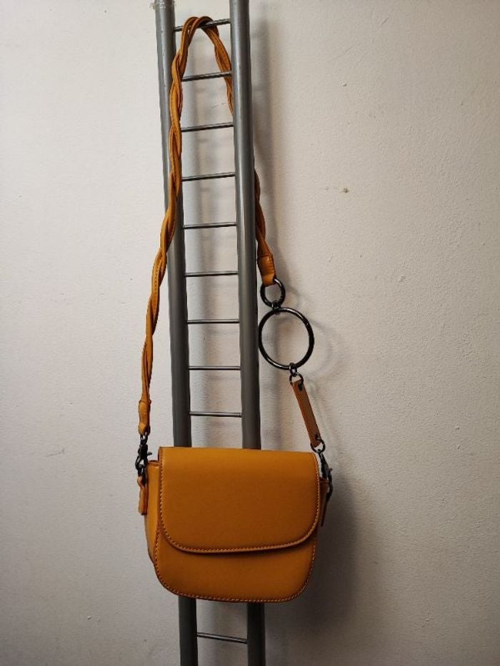 Petit sac bandoulière femme Belle boucle argenté Anses tressé Coloris moutarde Taille longueur 17 Hauteur 14 Profondeur 6 1 grande poche et 2 petites