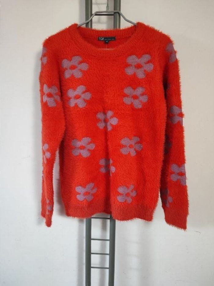 Pull fille Col rond Mélange de matière polyester acrylique Taille 12 ans Coloris orange avec motifs Attention voir photo une petite maille enlever sur l'épaule
