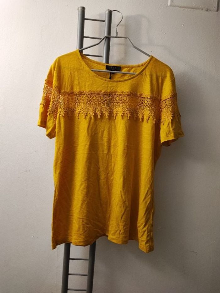 Superbe tee-shirt femme Bandes a l'avant avec broderie transparent Manches courtes Coloris moutarde Taille L